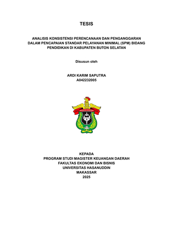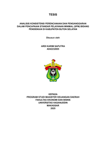 ARDI KARIM SAPUTRA. Analisis Konsistensi Perencanaan Dan Penganggaran Dalam Pencapaian Standar Pelayanan Minimal (SPM) Bidang Pendidikan Di Kabupaten Buton Selatan (dibimbing oleh Sri Sundari). Penelitian ini bertujuan untuk 1. Mengetahui bagaimana konsistensi antara perencanaan dan penganggaran Dinas Pendidikan Kabupaten Buton Selatan dalam pencapaian Standar Pelayanan Minimal (SPM). 2. Mengetahui mengapa Dinas Pendidikan Kabupaten Buton Selatan tidak mencapai indeks Standar Pelayanan Minimal (SPM). 3 mengetahui faktor penyebab tidak tercapainya Standar Pelayanan Minimal (SPM). Penelitian ini merupakan jenis penelitian deskriptif kualitatif. Lokasi penelitian ini dilakukan di Dinas Pendidikan Kabupaten Buton Selatan. Jenis data yang digunakan dalam penelitian ini yaitu data primer dan data sekunder, sedangkan sumber data dalam penelitian ini yaitu hasil wawancara dan data dokumen perencanaan dan penganggaran. Teknik pengumpulan data dalam penelitian ini yaitu dengan observasi, wawancara, dan studi dokumen. Hasil penelitian ini menunjukan 1. Tingkat konsistensi antara dokumen perencanaan dan dokumen pengangaran Dinas Pendidikan Kabupaten Buton Selatan dalam pemenuhan belanja Standar Pelayanan Minimal (SPM) tahun 2023 “Buruk” dan pada tahun 2024 “Baik”. 2. Tingkat konsistensi perencanaan dan penganggaran pemenuhan belanja Standar Pelayanan Minimal (SPM) tahun 2023 dan 2024 pada Dinas Pendidikan Kabupaten Buton Selatan terjadi peningkatan yang tidak dibarengi dengan peningkatan capaian SPM. 3. Tidak adanya data evaluasi pemenuhan SPM oleh Kementerian. 4. Terdapat beberapa kegiatan yang dilakukan oleh Dinas Pendidikan Kabupaten Buton Selatan tidak mendukung peningkatan capaian SPM Bidang Pendidikan. 5. Faktor penyebab tidak tercapainya Standar Pelayanan Minimal (SPM) Dinas Pendidikan Kabupaten Buton Selatan antara lain, kurangnya perencanaan berbasis data, ketersediaan Sub Kegiatan perbaikan belanja pemenuhan Standar Pelayanan Minimal (SPM) yang hampir seluruhnya tidak tersedia, dan kurangnya sumber daya manusia (SDM)
