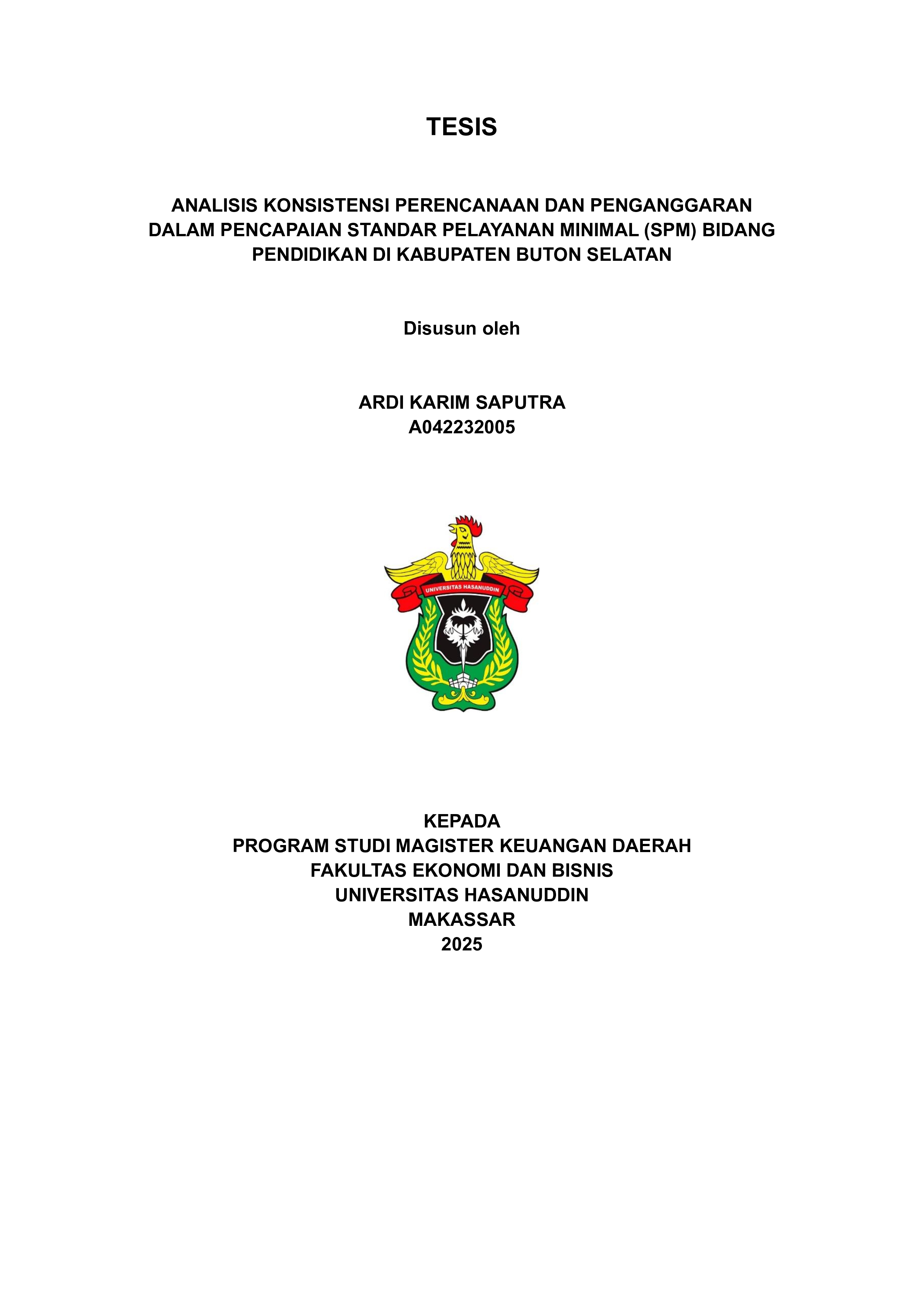 SAPUTRA, ARDI KARIM (2025) ANALISIS KONSISTENSI PERENCANAAN DAN PENGANGGARAN DALAM PENCAPAIAN STANDAR PELAYANAN MINIMAL (SPM) BIDANG PENDIDIKAN DI KABUPATEN BUTON SELATAN = ANALYSIS OF PLANNING AND BUDGETING CONSISTENCY IN ACHIEVING MINIMUM SERVICE STANDARDS (MSS) FOR EDUCATION IN SOUTH BUTON DISTRICT. Thesis thesis, Universitas Hasanuddin.