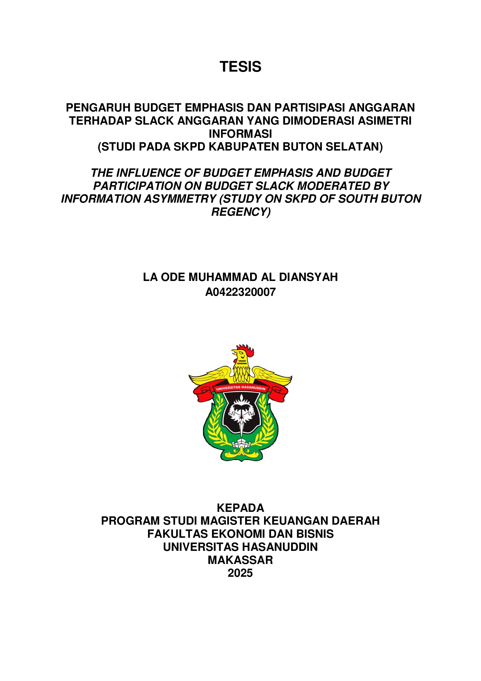 LA ODE MUHAMMAD AL DIANSYAH: “Pengaruh Budget Emphasis dan Partisipasi Anggaran Terhadap Slack Anggaran yang Dimoderasi Asimetri Informasi Studi Pada SKPD Kabupaten Buton Selatan”. Tesis Magister Keuangan Daerah, Fakultas Ekonomi dan Bisnis, Universitas Hasanuddin (Dibimbing oleh Prof. Dr. Maat Pono, SE., M.Si). Tujuan Penelitian ini untuk Menganalis Pengaruh Budget Emphasis, Partisipasi Anggaran dan Menganalisis Peran Asimetri Informasi dalam Memoderasi Hubungan Budget Emphasis, Partisipasi Anggaran terhadap Slack Anggaran di Kabupaten Buton Selatan Penelitian dilakukan pada Satuan Kerja Perangkat Daerah (SKPD) di Kabupaten Buton Selatan dengan pendekatan kuantitatif dan metode asosiatif kausal. Populasi dalam penelitian ini adalah Pegawai Negeri Sipil Esselon III dan IV, dengan total sampel sebanyak 109 responden dari 36 Organisasi Perangkat Daerah (OPD) yang dipilih melalui teknik purposive sampling. Analisis data dilakukan menggunakan metode Partial Least Square Structural Equation Modelling (PLS-SEM) dengan bantuan perangkat lunak SmartPLS 3.0. Hasil penelitian menunjukkan bahwa budget emphasis dan partisipasi anggaran berpengaruh signifikan terhadap budgetary slack. Selain itu, asimetri informasi terbukti memperlemah hubungan antara budget emphasis dan partisipasi anggaran terhadap budgetary slack. Temuan ini memberikan implikasi penting bagi pengelolaan anggaran di sektor publik agar lebih efisien dan transparan