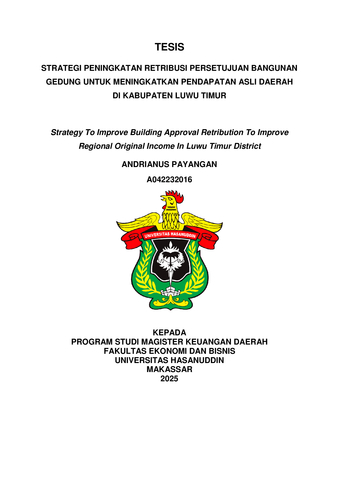 PAYANGAN, ANDRIANUS (2025) STRATEGI PENINGKATAN RETRIBUSI PERSETUJUAN BANGUNAN GEDUNG UNTUK MENINGKATKAN PENDAPATAN ASLI DAERAH DI KABUPATEN LUWU TIMUR = Strategy To Improve Building Approval Retribution To Improve Regional Original Income In Luwu Timur District. Thesis thesis, Universitas Hasanuddin.