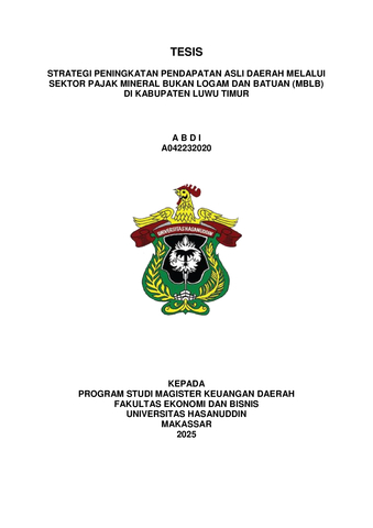 ABDI, ABDI (2025) STRATEGI PENINGKATAN PENDAPATAN ASLI DAERAH MELALUI SEKTOR PAJAK MINERAL BUKAN LOGAM DAN BATUAN (MBLB) DI KABUPATEN LUWU TIMUR = STRATEGY FOR INCREASING LOCAL ORIGINAL REVENUE THROUGH THE NON-METAL MINERAL AND ROCK TAX SECTOR (MBLB) IN EAST LUWU REGENCY. Thesis thesis, Universitas Hasanuddin.