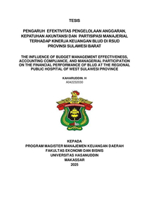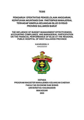 H, KAHARUDDIN. (2025) PENGARUH EFEKTIVITAS PENGELOLAAN ANGGARAN, KEPATUHAN AKUNTANSI DAN PARTISIPASI MANAJERIAL TERHADAP KINERJA KEUANGAN BLUD DI RSUD PROVINSI SULAWESI BARAT = THE INFLUENCE OF BUDGET MANAGEMENT EFFECTIVENESS, ACCOUNTING COMPLIANCE, AND MANAGERIAL PARTICIPATION ON THE FINANCIAL PERFORMANCE OF BLUD AT THE REGIONAL PUBLIC HOSPITAL OF WEST SULAWESI PROVINCE. Thesis thesis, Universitas Hasanuddin.