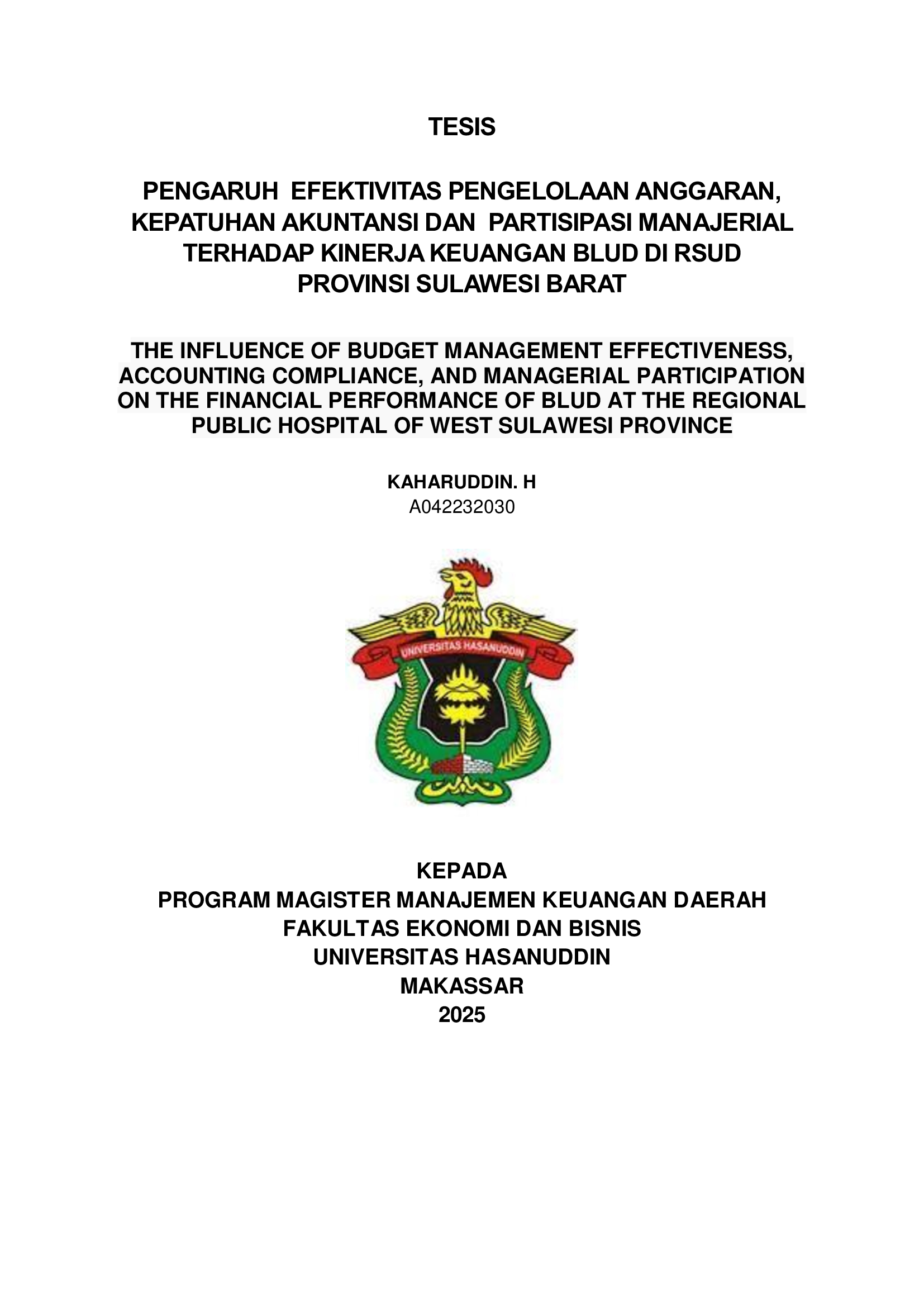 Kaharuddin H. 2025. Pengaruh Efektivitas Pengelolaan Anggaran, Kepatuhan Akuntansi, Dan Partisipasi Manajerial Terhadap Kinerja Keuangan Badan Layanan Umum Daerah (BLUD) Pada Rumah Sakit Umum Daerah Di Provinsi Sulawesi Barat. Dibimbing oleh Prof. Dr. Muh. Yunus Amar,SE.,MT Penelitian ini bertujuan untuk menganalisis pengaruh efektivitas pengelolaan anggaran, kepatuhan akuntansi, dan partisipasi manajerial terhadap kinerja keuangan Badan Layanan Umum Daerah (BLUD) pada Rumah Sakit Umum Daerah di Provinsi Sulawesi Barat. Latar belakang penelitian ini didasarkan pada pentingnya penguatan tata kelola keuangan BLUD untuk mewujudkan pelayanan kesehatan yang profesional dan berkelanjutan. Penelitian ini menggunakan pendekatan kuantitatif dengan metode regresi linear berganda. Data dikumpulkan melalui kuesioner yang disebarkan kepada responden yang terlibat dalam pengelolaan keuangan BLUD RS. Hasil analisis menunjukkan bahwa ketiga variabel independen yaitu efektivitas pengelolaan anggaran, kepatuhan akuntansi, dan partisipasi manajerial berpengaruh positif dan signifikan terhadap kinerja keuangan BLUD. Dari ketiga variabel tersebut, efektivitas pengelolaan anggaran memiliki pengaruh paling dominan terhadap kinerja keuangan BLUD, dengan nilai koefisien beta tertinggi sebesar 0,783. Temuan ini menunjukkan bahwa upaya peningkatan kinerja keuangan BLUD harus diarahkan pada penguatan sistem penganggaran yang efektif, peningkatan kepatuhan terhadap standar akuntansi pemerintah, dan pelibatan manajerial secara aktif dalam proses perencanaan dan pengendalian anggaran