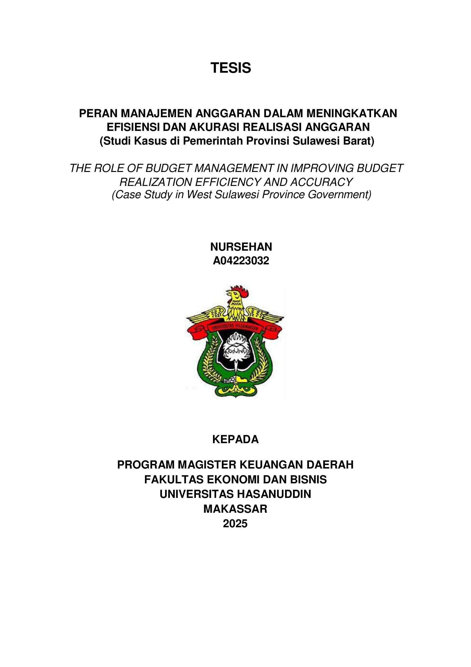 NURSEHAN, NURSEHAN (2025) PERAN MANAJEMEN ANGGARAN DALAM MENINGKATKAN EFISIENSI DAN AKURASI REALISASI ANGGARAN (Studi Kasus di Pemerintah Provinsi Sulawesi Barat) = THE ROLE OF BUDGET MANAGEMENT IN IMPROVING BUDGET REALIZATION EFFICIENCY AND ACCURACY (Case Study in West Sulawesi Province Government). Thesis thesis, Universitas Hasanuddin.