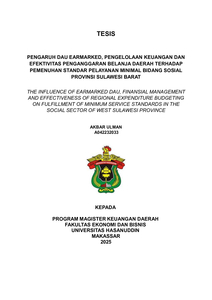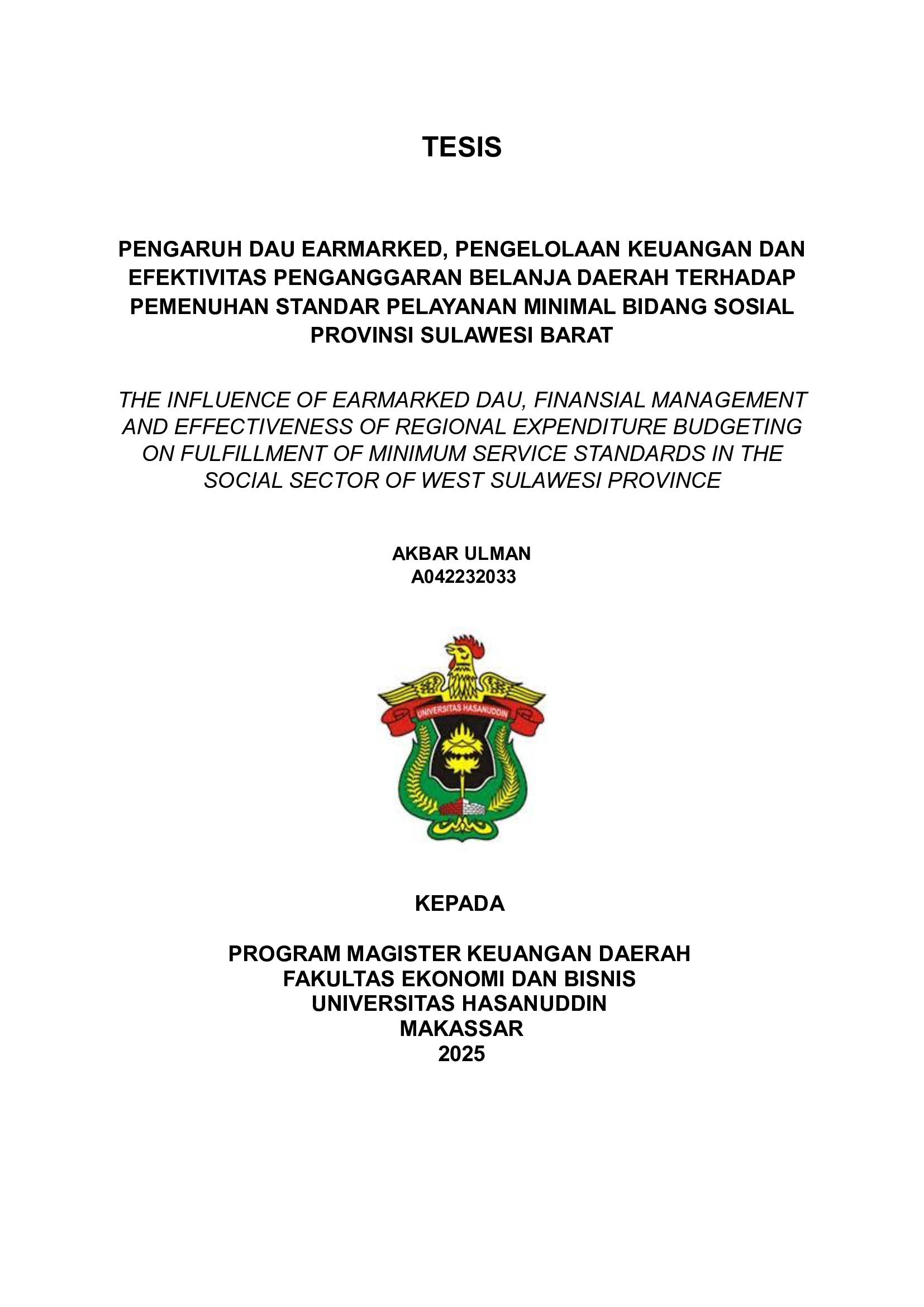 Akbar Ulman (2025), “Pengaruh DAU Earmarked, Pengelolaan Keuangan dan Efektivitas Penganggaran Belanja Daerah terhadap Pemenuhan Standar Pelayanan Minimal Bidang Sosial Provinsi Sulawesi Barat”. Tesis Magister Keuangan Daerah, Fakultas Ekonomi dan Bisnis, Universitas Hasanuddin. Dibimbing oleh Prof. Dr. Asri Usman, SE., M.Si., Ak., CA. Penelitian ini bertujuan untuk menganalisis pengaruh Dana Alokasi Umum (DAU) Earmarked, Pengelolaan Keuangan, dan Efektivitas Penganggaran Belanja Daerah terhadap pemenuhan Standar Pelayanan Minimal (SPM) Bidang Sosial di Provinsi Sulawesi Barat. Metode yang digunakan adalah kuantitatif dengan pendekatan regresi linear berganda. Sampel penelitian berjumlah 40 responden yang terdiri dari aparatur Dinas Sosial Provinsi Sulawesi Barat. Hasil penelitian menunjukkan bahwa secara parsial DAU Earmarked dan efektivitas penganggaran belanja daerah berpengaruh positif dan signifikan terhadap pemenuhan SPM bidang sosial, sedangkan pengelolaan keuangan berpengaruh signifikan namun negatif. Secara simultan, ketiga variabel independen tersebut memberikan pengaruh yang signifikan terhadap pemenuhan SPM. Temuan ini mengindikasikan pentingnya perencanaan anggaran yang efektif dan pengelolaan keuangan yang berorientasi pada hasil dalam mendukung layanan sosial dasar di daerah.
