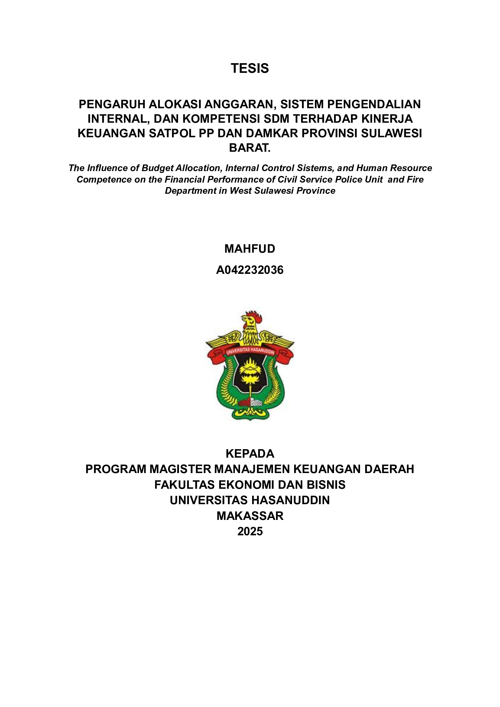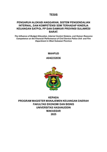 MAHFUD, MAHFUD (2025) PENGARUH ALOKASI ANGGARAN, SISTEM PENGENDALIAN INTERNAL, DAN KOMPETENSI SDM TERHADAP KINERJA KEUANGAN SATPOL PP DAN DAMKAR PROVINSI SULAWESI BARAT = The Influence of Budget Allocation, Internal Control Sistems, and Human Resource Competence on the Financial Performance of Civil Service Police Unit and Fire Department in West Sulawesi Province. Thesis thesis, Universitas Hasanuddin.