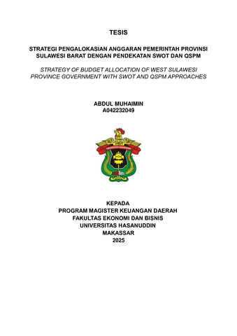 MUHAIMIN, ABDUL (2025) STRATEGI PENGALOKASIAN ANGGARAN PEMERINTAH PROVINSI SULAWESI BARAT DENGAN PENDEKATAN SWOT DAN QSPM = STRATEGY OF BUDGET ALLOCATION OF WEST SULAWESI PROVINCE GOVERNMENT WITH SWOT AND QSPM APPROACHES. Thesis thesis, Universitas Hasanuddin.
