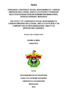 ALMIRA, RAHMA (2025) Pengaruh Corporate Social Responsibility, Carbon Emission Disclosure, dan Eco-efficiency terhadap Nilai Perusahaan dengan Kemampuan Manajerial sebagai Variabel Moderasi = The Effect of Corporate Social Responsibility, Carbon Emission Disclosure, and Eco-efficiency on Company Value with Managerial Ability as Moderating Variable. Thesis thesis, Universitas Hasanuddin.