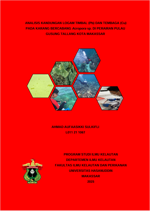 SULKIFLI, AHMAD AUFAASIKKI (2025) ANALISIS KANDUNGAN LOGAM TIMBAL (Pb) DAN TEMBAGA (Cu) PADA KARANG BERCABANG Acropora sp. DI PERAIRAN PULAU GUSUNG TALLANG KOTA MAKASSAR = LEAD (Pb) AND COPPER (Cu) METAL CONTENT ANALYSIS IN BRANCHING CORAL Acropora sp. IN THE WATERS OF GUSUNG TALLANG ISLAND MAKASSAR CITY. Skripsi thesis, Universitas Hasanuddin.