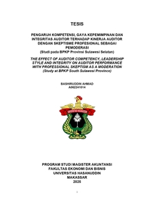 BASHIRUDDIN AHMAD. Pengaruh Kompetensi, Gaya Kepemimpinan dan Integritas Auditor terhadap Kinerja Auditor dengan Skeptisme Profesional sebagai Pemoderasi (Studi pada BPKP Provinsi Sulawesi Selatan), (dibimbing oleh Arifuddin). Dalam lingkungan bisnis yang semakin kompleks, auditor memiliki peran strategis dalam memastikan akuntabilitas dan kewajaran laporan keuangan melalui audit yang objektif. Namun, fenomena kinerja auditor belum optimal pada lembaga pengawasan pemerintah. Penelitian ini bertujuan untuk menganalisis pengaruh kompetensi, gaya kepemimpinan, dan integritas terhadap kinerja auditor, serta peran skeptisisme profesional sebagai pemoderasi. Penelitian ini menggunakan pendekatan kuantitatif dengan metode survei melalui kuesioner. Jumlah sampel berdasarkan purposive sampling yaitu 60 auditor dan data dianalisis menggunakan teknik SEM-PLS. Hasil penelitian menunjukkan bahwa nilai RSquare sebesar 0,780 menegaskan bahwa model penelitian ini memiliki kemampuan yang kuat dalam menjelaskan kinerja auditor. Kompetensi dan integritas berpengaruh positif dan signifikan terhadap kinerja auditor, sedangkan gaya kepemimpinan tidak menunjukkan pengaruh signifikan. Skeptisisme profesional berperan sebagai pemoderasi pada hubungan antara kompetensi dan integritas terhadap kinerja auditor, tetapi tidak pada hubungan antara gaya kepemimpinan dengan kinerja auditor.