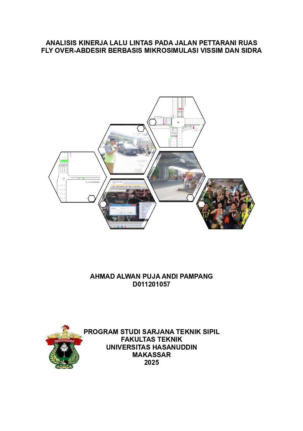 AHMAD ALWAN PUJA ANDI PAMPANG. ANALISIS KINERJA LALU LINTAS PADA JALAN PETTARANI RUAS FLY OVER-ABDESIR BERBASIS MIKROSIMULASI VISSIM DAN SIDRA (dibimbing oleh Muhammad Isran Ramli) Peningkatan infrastruktur transportasi memiliki peran krusial dalam mendukung aktivitas ekonomi dan mobilitas masyarakat, terutama di wilayah perkotaan seperti Makassar. Jalan Pettarani, sebagai salah satu jalur utama di kota ini, sering menghadapi masalah kemacetan, khususnya pada segmen Fly Over-Abdesir. Kondisi tersebut berdampak pada waktu tempuh perjalanan, penggunaan bahan bakar, dan peningkatan emisi polutan, yang pada akhirnya menurunkan kualitas hidup warga. Untuk mengatasi dan memahami persoalan ini secara mendalam, diperlukan analisis menyeluruh terhadap kinerja lalu lintas di ruas jalan tersebut. Penelitian ini menggunakan pendekatan mikrosimulasi lalu lintas dengan bantuan dua perangkat lunak, yaitu VISSIM dan SIDRA. VISSIM merupakan alat simulasi mikroskopis yang mampu memodelkan perilaku kendaraan dengan detail tinggi, sementara SIDRA dirancang untuk menganalisis kinerja simpang berdasarkan indikator seperti volume lalu lintas, waktu tunggu, dan tingkat pelayanan. Tujuan dari penelitian ini meliputi (1) menganalisis kinerja lalu lintas pada jalan Pettarani segmen Fly Over-Abdesir menggunakan SIDRA, (2) mengevaluasi kinerja lalu lintas dengan menggunakan VISSIM, dan (3) membandingkan hasil analisis dari kedua aplikasi tersebut untuk memahami kelebihan dan kekurangan masing-masing. Penelitian ini diharapkan dapat memberikan gambaran yang mendalam terkait efektivitas kedua perangkat lunak dalam menganalisis kinerja lalu lintas. Temuan yang dihasilkan diharapkan menjadi referensi bagi pemerintah kota Makassar dalam menyusun kebijakan untuk mengurangi kemacetan, sekaligus memberikan kontribusi bagi pengembangan metode analisis lalu lintas di Indonesia.