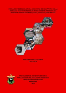 ABSTRAK MUHAMMAD IHSAN JASMAN. Pengaruh Kombinasi antara Usus Ayam dengan Pakan GELnat terhadap Faktor Kondisi dan Rasio Efisiensi Protein pada Budidaya Ikan Lele Dumbo (Clarias geriepenus) dengan RAS (dibimbing oleh Edison Saade). Latar belakang. Ikan lele dumbo (Clarias gariepenus) merupakan salah satu komoditas penting dalam budidaya perikanan air tawar. Tingginya permintaan pasar menuntut ketersediaan pakan yang efisien dan terjangkau. Namun, produktifitasnya belum optimal. Hal ini disebabkan oleh informasi tentang kombinasi jenis pakan yang paling menguntungkan masih kurang, termasuk penggunaan kombinasi usus ayam dan pakan GELnat. Tujuan. Penelitian ini bertujuan untuk menentukan kombinasi usus ayam dan pakan GELnat terbaik terhadap faktor kondisi dan rasio efisiensi protein pada ikan lele dumbo yang dipelihara pada Recirculating Aquaculture System (RAS). Metode. Penelitian ini didesain menggunakan Rancangan Acak Lengkap (RAL) dengan 5 perlakuan dan 3 ulangan, sehingga terdapat 15 satuan percobaan. Perlakuan kombinasi usus ayam dan pakan GELnat yang digunakan yaitu perlakuan A (100% usus ayam), perlakuan B (75% usus ayam: 25% pakan GELnat), perlakuan C (50% usus ayam: 50% pakan GELnat), perlakuan D (25% usus ayam: 75% pakan GELnat), perlakuan E (100% pakan GELnat). Wadah pemeliharaan berupa baskom dengan ukuran diameter 55 cm dan tinggi 25 cm. Parameter yang diamati adalah faktor kondisi, rasio efisiensi protein, dan kualitas air sebagai parameter penunjang. Hasil. Uji analisis ragam (ANOVA) menunjukkan bahwa kombinasi usus ayam dan pakan GELnat tidak berpengaruh nyata terhadap faktor kondisi, namun berpengaruh nyata terhadap rasio efisiensi protein. Pada perlakuan D (25% usus ayam: 75% pakan GELnat) berbeda nyata dengan semua perlakuan kecuali dengan perlakuan C, sedangkan antar perlakuan B (75%: 25%) dan perlakuan C (50%: 50%), serta antar perlakuan A (100% usus ayam) dan perlakuan E (100% pakan GELnat) tidak berbeda nyata. Faktor kondisi rata-rata yang diperoleh berada pada rentang 1,11-1,17. Rasio efisiensi protein tertinggi diperoleh pada perlakuan D sebesar 3.29%. Kesimpulan. Kombinasi usus ayam dan pakan GELnat yang terbaik adalah 25%:75%, namun kombinasi 50%:50% juga dapat digunakan pada pembesaran ikan lele dumbo. Kata kunci: Ikan lele dumbo; usus ayam; pakan GELnat; faktor kondisi; rasio efisiensi protein; RAS.