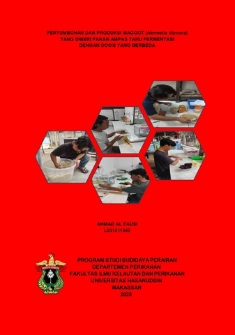 AHMAD AL FAUSI. “Pertumbuhan Dan Produksi Maggot (Hermetia Illucens) Yang Diberi Pakan Ampas Tahu Fermentasi Dengan Dosis Yang Berbeda” (dibimbing oleh Ibu Badraeni, MP). Latar belakang. Hermetia illucens, atau yang lebih dikenal sebagai maggot, merupakan organisme yang menjanjikan. Selain memiliki kandungan protein yang tinggi, maggot juga efektif dalam mengurai limbah organik dan dapat dijadikan sebagai pakan tambahan yang bernutrisi. Maggot menghasilkan enzim alami yang dapat meningkatkan efisiensi pencernaan pada ikan, sehingga sangat baik sebagai pakan tambahan. Metode. Penelitian ini berlangsung pada bulan Maret 2025 bertempat di Hatchery Universitas Hasanuddin, Fakultas Ilmu Kelautan dan Perikanan, Departemen Perikanan. Hewan uji yang digunakan pada penelitian ini yaitu baby maggot yang baru berumur 5 hari dengan ukuran awal berkisar antara 0,00102 g/individu. Penelitian dirancang dengan menggunakan rancangan acak lengkap (RAL) yang terdiri atas 4 perlakuan dan setiap perlakuan mempunyai 3 kali ulangan sehingga jumlah total unit penelitian adalah 12 unit yang terdiri dari 4 perlakuan yaitu (A) 60mg/individu/hari, (B) 70mg/individu/hari, (C) 80mg/individu/hari, (D) 90mg/individu/hari. Hasil. Data hasil penelitian yang dianalisis menggunakan uji One Way ANOVA, menunjukkan bahwa dosis pakan berpengaruh sangat nyata (P<0,01) terhadap pertumbuhan dan produksi maggot. Selanjutnya hasil uji lanjut W tuckey menunjukkan bahwa perlakuan (D) 90mg/individu/hari secara nyata (P<0.05) didapatkan pertumbuhan tinggi yaitu sebesar 0,1423±0,00088g dan produksi sebesar 81,0467±1,24g. Kesimpulan. Berdasarkan hasil penelitian bahwa pakan ampas tahu dengan dosis pakan 90mg/hari/individu mampu memberikan pertumbuhan dan produksi terbaik.