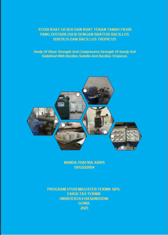 ARVIS, NANDA ZHAFIRA (2025) STUDI KUAT GESER DAN KUAT TEKAN TANAH PASIR YANG DISTABILISASI DENGAN BAKTERI BACILLUS SUBTILIS DAN BACILLUS TROPICUS = STUDY OF SHEAR STRENGTH AND COMPRESSIVE STRENGTH OF SANDY SOIL STABILIZED WITH BACILLUS SUBTILIS AND BACILLUS TROPICUS. Thesis thesis, Universitas Hasanuddin.