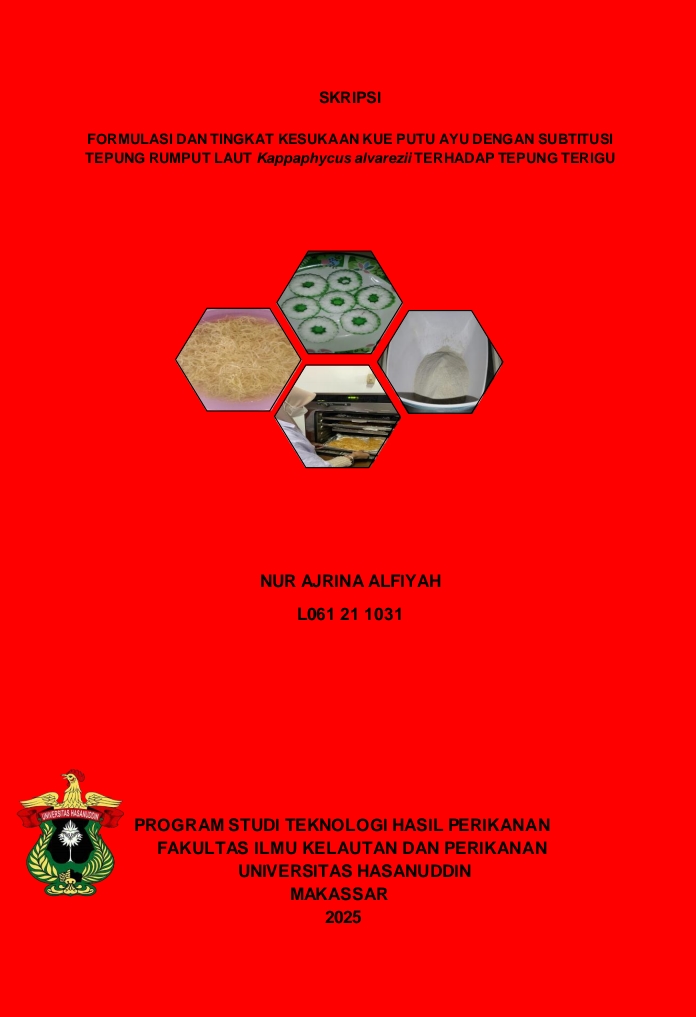 ALFIYAH, NUR AJRINA (2025) Formulasi dan tingkat kesukaan kue putu ayu dengan subtitusi tepung rumput laut kappaphycus alvarezii terhadap tepung terigu = Formulation and preference level of putu ayu cake with Kappaphycus alvarezii seaweed flour substitution for wheat flour. Skripsi thesis, Universitas Hasanuddin.
