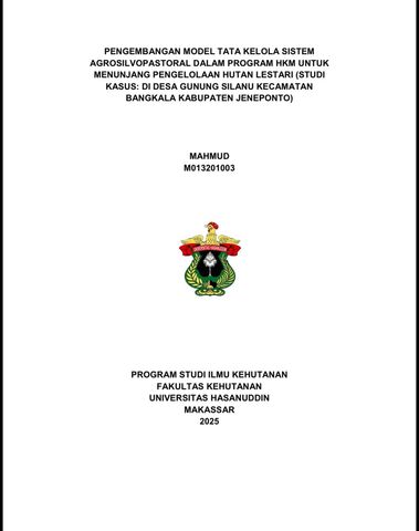 MAHMUD, MAHMUD (2025) PENGEMBANGAN MODEL TATA KELOLA SISTEM AGROSILVOPASTORAL DALAM PROGRAM HKM UNTUK MENUNJANG PENGELOLAAN HUTAN LESTARI (STUDI KASUS: DI DESA GUNUNG SILANU KECAMATAN BANGKALA KABUPATEN JENEPONTO) = DEVELOPMENT OF AGROSILVOPASTURE SYSTEM GOVERNANCE MODEL IN THE HKM PROGRAM TO SUPPORT SUSTAINABLE FOREST MANAGEMENT (CASE STUDY: IN GUNUNG SILANU VILLAGE, BANGKALA DISTRICT, JENEPONTO REGENCY). Disertasi thesis, Universitas Hasanuddin.
