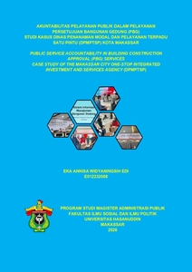 EDI, EKA ANNISA WIDYANINGSIH (2026) AKUNTABILITAS PELAYANAN PUBLIK DALAM PELAYANAN PERSETUJUAN BANGUNAN GEDUNG (PBG) Studi Kasus Dinas Penanaman Modal Dan Pelayanan Terpadu Satu Pintu (DPMPTSP) Kota Makassar = PUBLIC SERVICE ACCOUNTABILITY IN BUILDING CONSTRUCTION APPROVAL (PBG) SERVICES Case Study of the Makassar City One-Stop Integrated Investment and Services Agency (DPMPTSP). Thesis thesis, Universitas Hasanuddin.