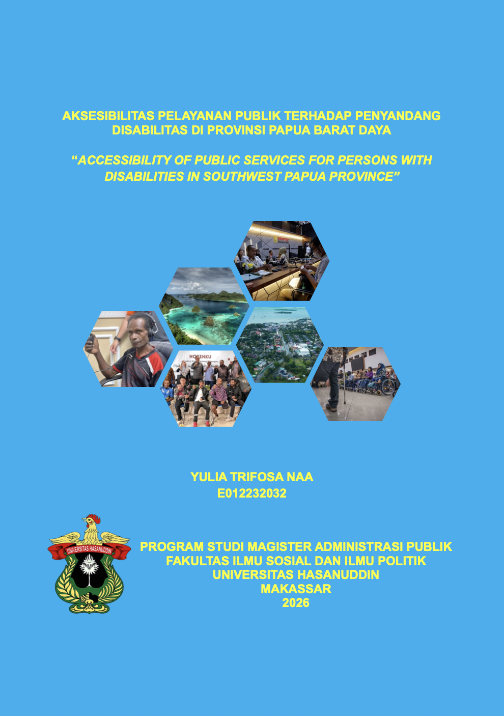 NAA, YULIA TRIFOSA (2026) AKSESIBILITAS PELAYANAN PUBLIK TERHADAP PENYANDANG DISABILITAS DI PROVINSI PAPUA BARAT DAYA = ACCESSIBILITY OF PUBLIC SERVICES FOR PERSONS WITH DISABILITIES IN SOUTHWEST PAPUA PROVINCE. Thesis thesis, Universitas Hasanuddin.