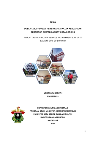 Nomensen Kareth. Public Trust dalam Pembayaran Pajak Kendaraan Bermotor di UPTD Samsat Kota Sorong (dibimbing oleh Prof. Dr. H. Badu Ahmad, M.Si.) Penelitian ini bertujuan menganalisis kepercayaan publik (public trust) dalam pembayaran Pajak Kendaraan Bermotor di UPTD Samsat Kota Sorong dengan menggunakan model Kim (2005) yang terdiri atas lima dimensi: kompetensi, kejujuran, keadilan, niat baik, dan komitmen kredibel. Penelitian ini menggunakan pendekatan kualitatif dengan metode studi kasus melalui wawancara mendalam, observasi, dan telaah dokumentasi untuk menggambarkan hubungan antara perilaku aparatur dan persepsi masyarakat terhadap pelayanan publik. Informan terdiri dari unsur pemerintah daerah, mitra lembaga seperti PT Jasa Raharja, serta masyarakat pengguna layanan Samsat. Hasil penelitian menunjukkan bahwa kepercayaan publik terbentuk melalui kinerja aparatur yang profesional, transparan, dan berintegritas. Dimensi kompetensi tercermin dari kemampuan teknis dan responsivitas petugas dalam memberikan pelayanan cepat dan akurat, sedangkan kejujuran tampak melalui sistem yang terbuka dan bebas pungutan liar. Keadilan terwujud dari kesetaraan perlakuan bagi seluruh wajib pajak, niat baik tercermin melalui empati terhadap kesulitan masyarakat, dan komitmen kredibel terlihat dari konsistensi kebijakan serta ketepatan waktu pelayanan. Meski demikian, aspek keterbukaan informasi publik dan inklusivitas masih perlu diperkuat untuk menjaga keberlanjutan kepercayaan masyarakat. Temuan ini menegaskan bahwa kepercayaan publik di UPTD Samsat Kota Sorong tumbuh dari sinergi antara kapasitas teknis, etika moral, dan konsistensi kelembagaan. Penguatan nilai transparansi, empati, dan prediktabilitas kebijakan menjadi faktor kunci dalam membangun legitimasi dan kepatuhan pajak secara sukarela di tingkat daerah.