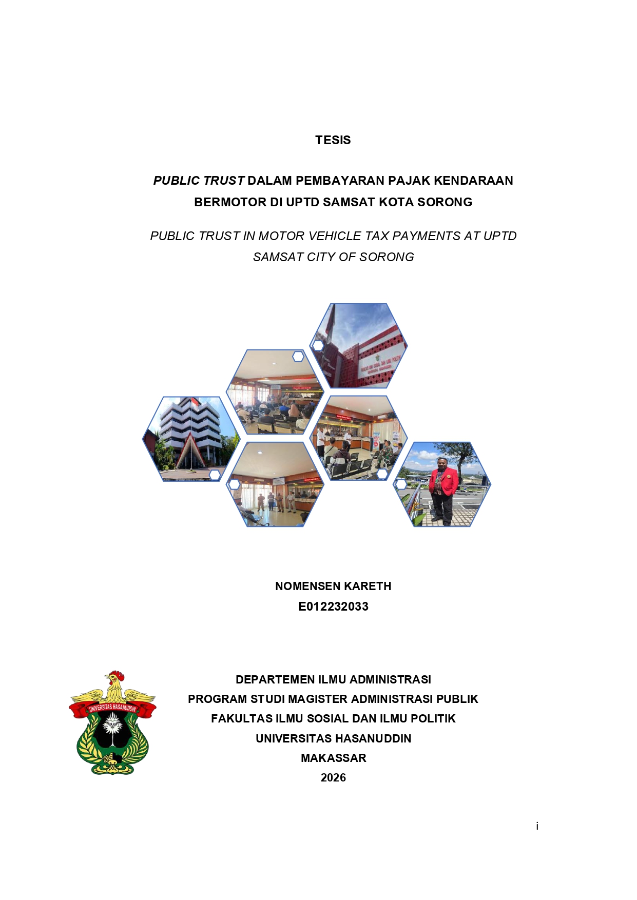KARETH, NOMENSEN (2026) PUBLIC TRUST DALAM PEMBAYARAN PAJAK KENDARAAN BERMOTOR DI UPTD SAMSAT KOTA SORONG = PUBLIC TRUST IN MOTOR VEHICLE TAX PAYMENTS AT UPTD SAMSAT CITY OF SORONG. Thesis thesis, Universitas Hasanuddin.