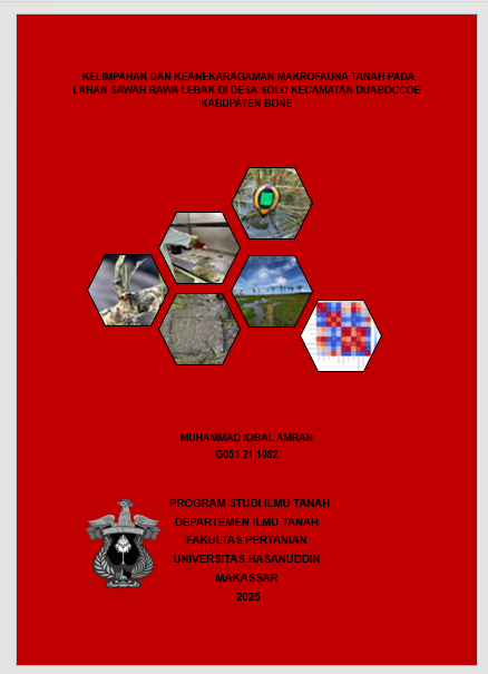 MUHAMMAD IQBAL AMRAN. Kelimpahan dan Keanekaragaman Makrofauna Tanah pada Lahan Sawah Rawa Lebak di Desa Solo Kecamatan Duaboccoe Kabupaten Bone (dibimbing oleh Risky Nurhikmayani). Latar belakang. Pertanian Indonesia menghadapi degradasi tanah, alih fungsi lahan, dan ketergantungan pada input kimia yang menurunkan produktivitas. Lahan rawa, khususnya rawa lebak, berpotensi mendukung ketahanan pangan jika dikelola sesuai karakteristik lokal. Makrofauna tanah berperan penting dalam menjaga kesuburan melalui dekomposisi bahan organik dan perbaikan struktur tanah, sehingga dapat menjadi indikator kesehatan tanah. Tujuan. Penelitian ini bertujuan mengidentifikasi jenis-jenis makrofauna tanah pada tiga tipologi lahan rawa lebak (dangkal, tengah, dan dalam) serta menganalisis pengaruh sifat fisik dan kimia tanah terhadap kelimpahan dan keanekaragamannya. Metode. Penelitian dilakukan dengan metode Hand Shorting pada lima titik pengamatan di setiap tipologi lebak menggunakan kotak monolit berukuran 25×25×10 cm.. Hasil. Tekstur tanah didominasi liat dengan pH 5,79–6,69, C-organik 1,09–2,05 %, dan N-total 0,08–0,38%. Kelimpahan makrofauna tertinggi terdapat pada lebak dalam (960 individu/m³), diikuti lebak tengah (704 individu/m³) dan lebak dangkal (160 individu/m³). Nilai H’ tertinggi pada lebak tengah (0,83) dan D tertinggi pada lebak dangkal (1). C-organik berhubungan kuat dengan kelimpahan, sedangkan N-total berpengaruh terhadap keanekaragaman. Kesimpulan Pada lahan lebak dalam, kelimpahan makrofauna tanah tergolong paling tinggi dibandingkan tipologi lainnya, dengan total populasi mencapai 960 individu/m³. Komunitas makrofauna didominasi oleh keong sawah (60%) dan cacing tanah (40%), menunjukkan adanya dua kelompok utama yang berkembang relatif seimbang.