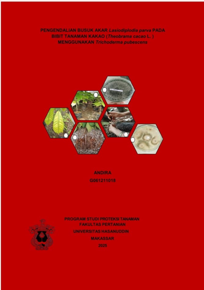 ANDIRA. Pengendalian busuk akar Lasiodiplodia parva pada bibit tanaman kakao (Theobroma cacao L.) menggunakan Trichoderma pubescens (dibimbing oleh Ade Rosmana). Latar Belakang. Kakao (Theobroma cacao L.) merupakan komoditas perkebunan penting di Indonesia, namun produktivitasnya sering terhambat oleh penyakit busuk akar yang disebabkan oleh Lasiodiplodia parva. Patogen ini merusak sistem perakaran, menurunkan penyerapan air dan hara, sehingga menghambat pertumbuhan bahkan menyebabkan kematian tanaman. Pengendalian ramah lingkungan melalui agens hayati diperlukan untuk mengatasi masalah ini. Tujuan. penelitian adalah untuk mengetahui pengaruh penggunaan T. pubescens dalam pengendalian busuk leher dan akar (L. parva) pada tanaman bibit kakao. Metode. penelitian dilaksanakan di Laboratorium Departemen Hama dan Penyakit Tumbuhan serta green house Fakultas Pertanian Universitas Hasanuddin, Makassar, pada Februari–Mei 2025. Rancangan penelitian menggunakan Rancangan Acak Lengkap (RAL) dengan empat perlakuan, yaitu kontrol, T. pubescens, L. parva, serta kombinasi T. pubescens + L. parva, masing-masing dengan lima ulangan. Hasil. penelitian menunjukkan bahwa perlakuan T. pubescens menekan insidensi penyakit hingga 55,69% pada 63 hari setelah inokulasi, lebih rendah dibandingkan kombinasi dengan L. parva (69,10%) maupun infeksi tunggal L. parva (37,25%). Berat akar pada perlakuan T. pubescens mencapai 17,8 g, setara dengan kontrol (17,8 g) dan lebih tinggi dibandingkan infeksi L. parva (13,2 g). Panjang nekrosis pada perlakuan T. pubescens tercatat 0 mm, berbeda nyata dengan L. parva (6,92 mm) maupun kombinasi (12,4 mm). Kolonisasi T. pubescens pada perakaran mencapai 38%, sedangkan L. parva tertinggi pada perlakuan tunggal (20%). Kesimpulan, aplikasi T. pubescens efektif menekan penyakit busuk akar, menjaga kesehatan sistem perakaran, serta berpotensi digunakan sebagai agens pengendali hayati ramah lingkungan pada tahap pembibitan kakao.