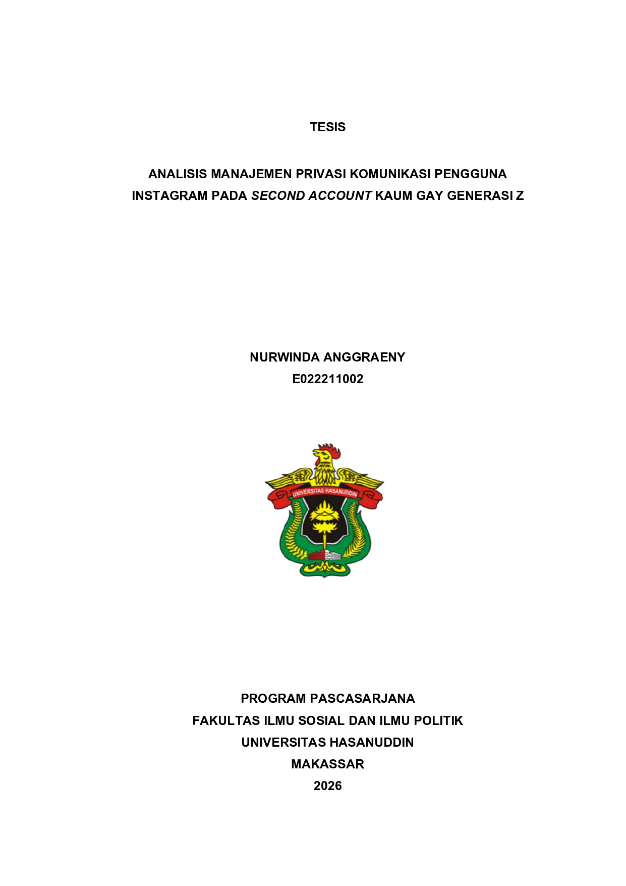 ANGGRAENY, NURWINDA (2026) ANALISIS MANAJEMEN PRIVASI KOMUNIKASI PENGGUNA INSTAGRAM PADA SECOND ACCOUNT KAUM GAY GENERASI Z = Analysis of Communication Privacy Management of Instagram User on Second Account of the Gay Z Generation. Thesis thesis, Universitas Hasanuddin.