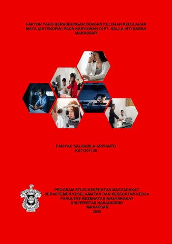 ARIYANTO, FAISYAH SALSABILA (2026) FAKTOR YANG BERHUBUNGAN DENGAN KELUHAN KELELAHAN MATA (ASTENOPIA) PADA KARYAWAN DI PT KALLA INTI KARSA MAKASSAR = FACTOR RELATED TO COMPLAINTS OF EYE FATIGUE (ASTENOPIA) IN EMPLOYEES AT PT KALLA INTI KARSA MAKASSAR. Skripsi thesis, Universitas Hasanuddin.