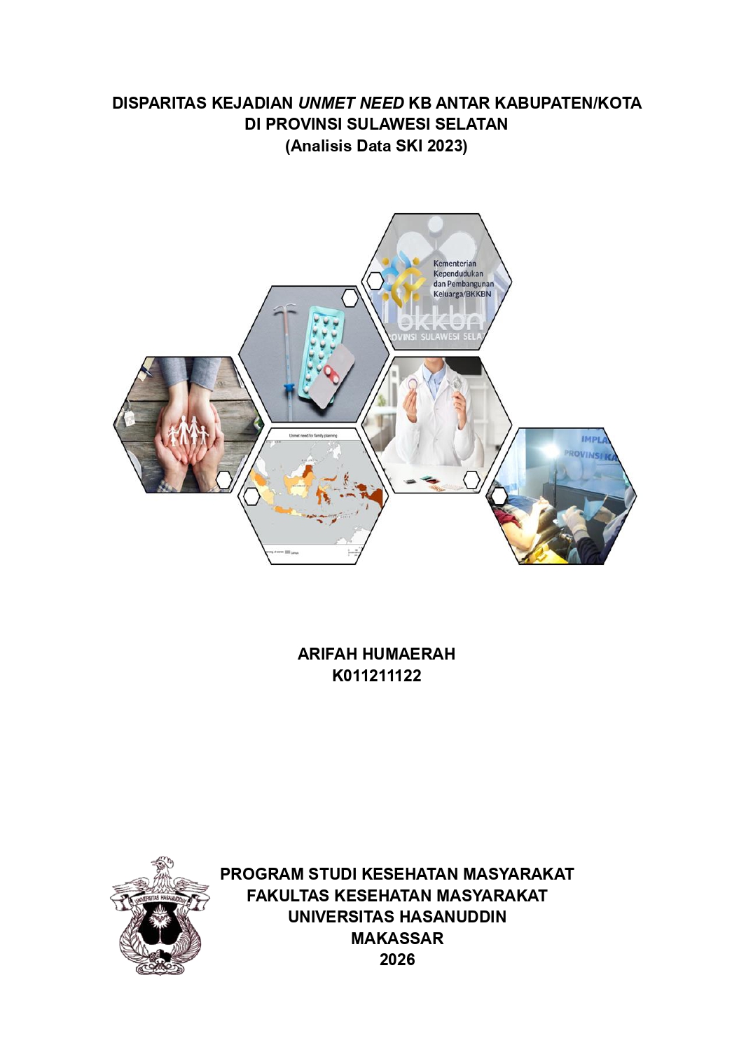 HUMAERAH, ARIFAH (2026) Disparitas Kejadian Unmet Need KB antar Kabupaten/ Kota di Provinsi Sulawesi Selatan (Analisis Data SKI 2023) = Disparities in Unmet Need for Family Planning Between Districts/Cities in South Sulawesi Province (2023 Indonesian Health Survey Data Analysis). Skripsi thesis, Universitas Hasanuddin.
