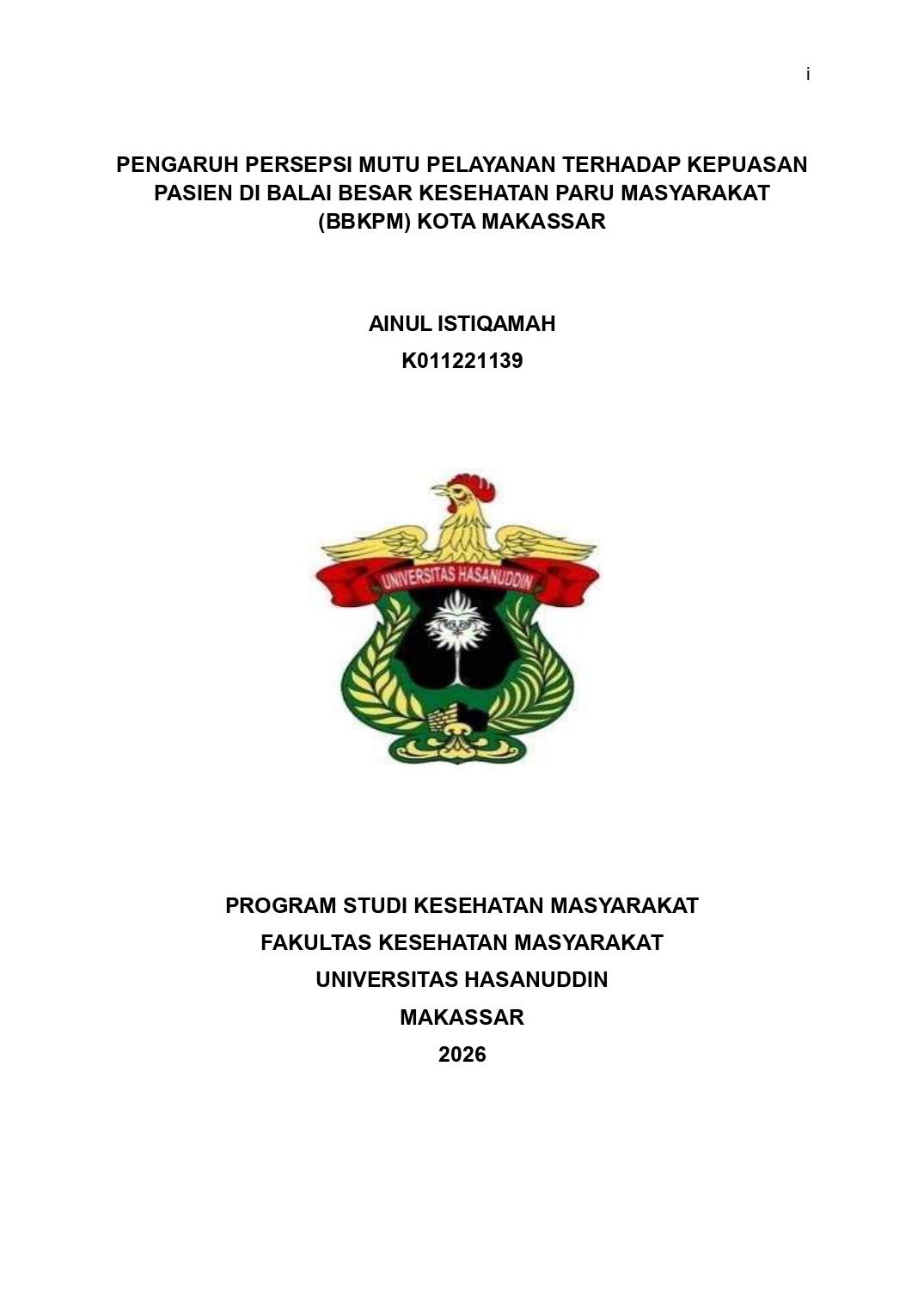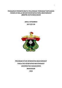 ISTIQAMAH, AINUL (2026) PENGARUH PERSEPSI MUTU PELAYANAN TERHADAP KEPUASAN PASIEN DI BALAI BESAR KESEHATAN PARU MASYARAKAT (BBKPM) KOTA MAKASSAR = THE INFLUENCE OF PERCEIVED SERVICE QUALITY ON PATIENT SATISFACTION AT THE CENTER FOR PUBLIC LUNG HEALTH (BBKPM) IN MAKASSAR CITY. Skripsi thesis, Universitas Hasanuddin.