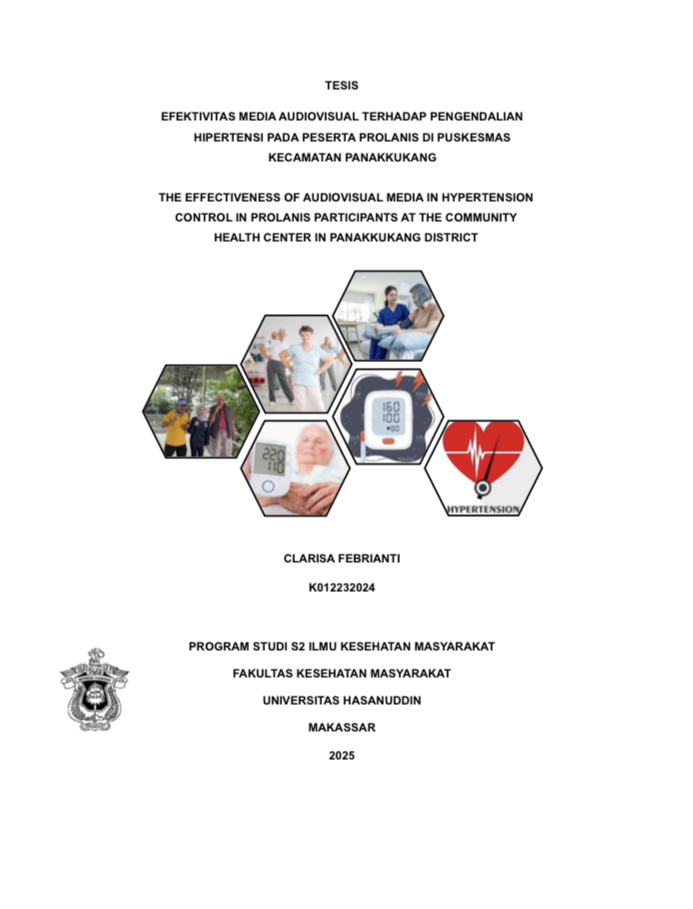 ABSTRAK CLARISA FEBRIANTI. EFEKTIVITAS MEDIA AUDIOVISUAL TERHADAP PENGENDALIAN HIPERTENSI PADA PESERTA PROLANIS DI PUSKESMAS KECAMATAN PANAKKUKANG KOTA MAKASSAR (dibimbing oleh Ridwan Mochtar Thaha dan Muhammad Syafar) Latar Belakang. Hipertensi merupakan salah satu penyakit tidak menular utama penyebab kematian prematur di dunia. Rendahnya pemahaman dan kepatuhan pasien dalam pengendalian hipertensi masih menjadi tantangan. Pemanfaatan media audiovisual diharapkan dapat meningkatkan pengetahuan, sikap, dan tindakan melalui pembelajaran multisensori yang menarik. Tujuan. Menganalisis efektivitas media audiovisual terhadap peningkatan perilaku pengendalian hipertensi pada peserta Program Pengelolaan Penyakit Kronis (Prolanis) di Puskesmas Kecamatan Panakkukang Kota Makassar. Metode. Penelitian ini menggunakan desain quasi experimental dengan rancangan one group pretest posttest with repeated treatment. Sampel berjumlah 87 peserta Prolanis yang ditentukan dengan teknik total sampling. Intervensi berupa edukasi menggunakan video berdurasi 7 menit tentang pengendalian hipertensi. Pengukuran dilakukan pada tahap pre-test, post-test 1 (setelah intervensi), dan post-test 2 (tujuh hari kemudian). Analisis data menggunakan uji Friedman dan Wilcoxon dengan tingkat signifikansi p < 0,05. Hasil. Setelah intervensi edukasi menggunakan media audiovisual, terjadi peningkatan signifikan pada seluruh aspek perilaku kesehatan peserta Prolanis. Rata-rata skor pengetahuan meningkat dari 5,24 menjadi 9,20, sikap dari 22,63 menjadi 37,94, dan tindakan dari 5,34 menjadi 9,17 (p < 0,001). Proporsi responden dengan kategori perilaku cukup meningkat dari kurang dari 30% menjadi 100% pada pengukuran tujuh hari setelah intervensi, menunjukkan efektivitas media audiovisual dalam memperkuat pengetahuan, sikap, dan tindakan pengendalian hipertensi secara berkelanjutan. Kesimpulan. Media audiovisual terbukti efektif meningkatkan pengetahuan, sikap, dan tindakan peserta Prolanis dalam pengendalian hipertensi. Puskesmas disarankan memanfaatkan media audiovisual secara rutin sebagai sarana edukasi kesehatan yang menarik dan sesuai karakteristik peserta lansia.