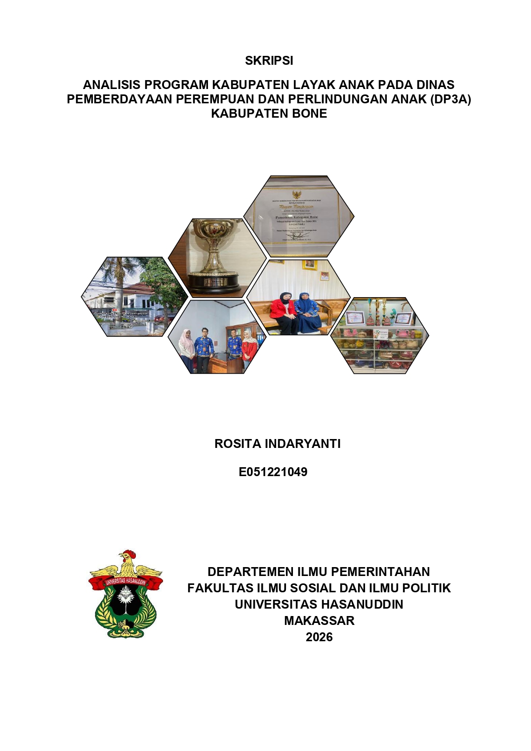 ABSTRAK ANALISIS PROGRAM KABUPATEN LAYAK ANAK PADA DINAS PEMBERDAYAAN PEREMPUAN DAN PERLINDUNGAN ANAK (DP3A) KABUPATEN BONE Oleh: Rosita Indaryanti Pembimbing: Dr. A. Lukman Irwan, S.Ip., M. Si. Penelitian ini bertujuan untuk menganalisis secara mendalam peran strategis Dinas Pemberdayaan Perempuan dan Perlindungan Anak (DP3A) Kabupaten Bone dalam upaya mewujudkan Kabupaten Layak Anak (KLA) sebagai bentuk komitmen pemerintah daerah dalam pemenuhan hak-hak anak. Program KLA dipandang sebagai fondasi penting dalam meningkatkan kualitas hidup anak, menjamin perlindungan, serta menciptakan lingkungan sosial yang aman, ramah, dan suportif bagi tumbuh kembang anak. Penelitian ini menggunakan pendekatan kualitatif deskriptif dengan mengumpulkan data melalui wawancara mendalam dengan aparat DP3A, observasi pada kegiatan terkait KLA, serta analisis dokumen kebijakan dan laporan pelaksanaan program. Namun demikian, penelitian ini juga menemukan beberapa hambatan dalam pelaksanaan program, seperti keterbatasan sumber daya manusia, kurangnya pemahaman masyarakat mengenai konsep KLA, serta belum meratanya sarana dan prasarana pendukung di wilayah kecamatan dan desa. Rendahnya koordinasi dari sebagian perangkat daerah turut menjadi tantangan dalam pencapaian indikator KLA secara optimal. Oleh karena itu, penelitian ini merekomendasikan perlunya penguatan kapasitas kelembagaan, peningkatan anggaran program perlindungan anak, serta penguatan peran Forum Anak sebagai mitra strategis dalam memastikan suara anak terakomodasi dalam proses pembangunan daerah. Dengan langkah-langkah tersebut, DP3A Kabupaten Bone diharapkan mampu mempercepat terwujudnya Kabupaten Layak Anak yang berkelanjutan dan berkeadilan. Kata Kunci: DP3A Kabupaten Bone, Kabupaten Layak Anak, Perlindungan Anak, Kebijakan Daerah, Koordinasi Lintas Sektor.