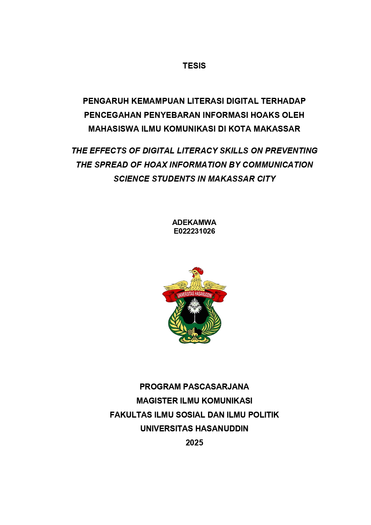 ADEKAMWA, ADEKAMWA (2025) PENGARUH KEMAMPUAN LITERASI DIGITAL TERHADAP PENCEGAHAN PENYEBARAN INFORMASI HOAKS OLEH MAHASISWA ILMU KOMUNIKASI DI KOTA MAKASSAR = THE EFFECTS OF DIGITAL LITERACY SKILLS ON PREVENTING THE SPREAD OF HOAX INFORMATION BY COMMUNICATION SCIENCE STUDENTS IN MAKASSAR CITYTHE EFFECTS OF DIGITAL LITERACY SKILLS ON PREVENTING THE SPREAD OF HOAX INFORMATION BY COMMUNICATION SCIENCE STUDENTS IN MAKASSAR CITY. Thesis thesis, UNIVERSITAS HASANUDDIN.