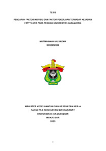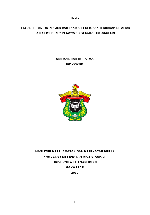 HUSAEMA, MUTMAINNAH (2025) PENGARUH FAKTOR INDIVIDU DAN FAKTOR PEKERJAAN TERHADAP KEJADIAN FATTY LIVER PADAPEGAWAI UNIVERSITAS HASANUDDIN = THE IMPACT OF PERSONAL AND WORK-RELATED FACTORS ON FATTY LIVER DISEASE AMONG UNIVERSITY STAFF: A STUDY AT UNIVERSITAS HASANUDDIN. Thesis thesis, Universitas Hasanuddin.
