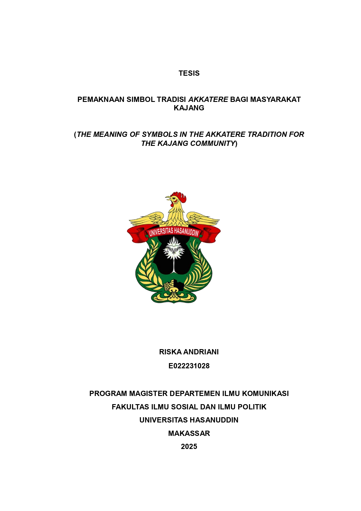 ANDRIANI, RISKA (2025) Pemaknaan Simbol Tradisi Akkatere Bagi Masyarakat Kajang Luar = THE MEANING OF SYMBOLS IN THE AKKATERE TRADITION FOR THE KAJANG COMMUNITY. Thesis thesis, UNIVERSITAS HASANUDDIN.