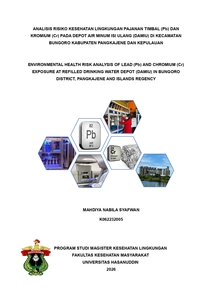 ABSTRAK MAHDIYA NABILA SYAFWAN. Analisis Risiko Kesehatan Lingkungan Pajanan Timbal (Pb) Dan Kromium (Cr) Pada Depot Air Minum Isi Ulang (Damiu) Di Kecamatan Bungoro Kabupaten Pangkajene Dan Kepulauan. (Dibimbing oleh Anwar Daud dan Mahatma Lanuru). Latar Belakang. Depot Air Minum Isi Ulang (DAMIU) merupakan sumber air minum utama masyarakat di wilayah yang belum terlayani air perpipaan. Namun, kualitas air DAMIU berpotensi terkontaminasi logam berat akibat aktivitas industri. Kecamatan Bungoro merupakan kawasan industri semen dan pertambangan batu kapur yang berpotensi melepaskan timbal (Pb) dan kromium heksavalen (CrVI) ke lingkungan. Pajanan kronik logam berat melalui konsumsi air minum dapat menimbulkan risiko kesehatan non-karsinogenik maupun karsinogenik. Tujuan. Penelitian ini bertujuan untuk menganalisis risiko kesehatan akibat pajanan Pb dan CrVI melalui konsumsi air minum isi ulang pada masyarakat dewasa di Kecamatan Bungoro Kabupaten Pangkajene dan Kepulauan. Metode. Penelitian ini menggunakan desain Analisis Risiko Kesehatan Lingkungan (ARKL) dengan pendekatan kuantitatif. Sampel air minum diambil dari DAMIU yang digunakan masyarakat, sedangkan responden merupakan penduduk dewasa. Parameter yang dianalisis meliputi konsentrasi Pb dan CrVI dalam air minum, berat badan responden, laju konsumsi air, frekuensi pajanan, dan durasi pajanan. Konsentrasi Pb dan CrVI dianalisis secara laboratoris, kemudian dihitung nilai intake, Risk Quotient (RQ) untuk Pb, serta Excess Cancer Risk (ECR) untuk CrVI pada skenario pajanan realtime dan lifetime.Hasil. Hasil analisis menunjukkan bahwa konsentrasi rata-rata Pb sebesar 0,0216 mg/L dan CrVI sebesar 0,015 mg/L dalam air minum isi ulang. Berat badan responden dewasa berkisar antara 45–75 kg dengan laju konsumsi air 2–2,5 liter/hari, frekuensi pajanan 350–365 hari/tahun, dan durasi pajanan hingga 30 tahun. Nilai RQ Pb pada seluruh responden dewasa berada di bawah 1, menunjukkan tidak adanya potensi risiko kesehatan non-karsinogenik pada pajanan saat ini,hasil analisis risiko karsinogenik menunjukkan nilai ECR CrVI pada skenario pajanan lifetime berkisar ≥1×10⁻⁴ Hasil ini menunjukkan bahwa risiko kanker akibat paparan CrVI berada dalam batas yang dapat diterima (acceptable) dan mengindikasikan bahwa pajanan CrVI melalui jalur paparan yang diteliti tergolong rendah pada seluruh responden. Kesimpulan. Pajanan Pb melalui konsumsi air minum isi ulang pada masyarakat dewasa di Kecamatan Bungoro berada pada tingkat yang relatif aman secara non-karsinogenik, namun pajanan CrVI berpotensi menimbulkan risiko karsinogenik pada pajanan jangka panjang. Oleh karena itu, diperlukan pengawasan kualitas DAMIU, pengendalian sumber pencemar industri, serta pengelolaan risiko kesehatan lingkungan guna melindungi kesehatan masyarakat.