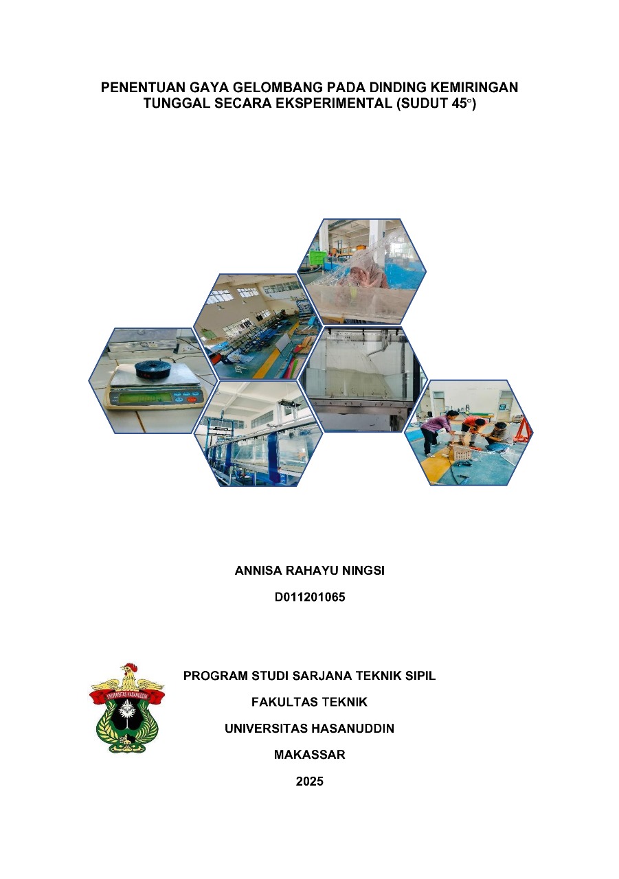 NINGSI, ANNISA RAHAYU (2025) Penentuan Gaya Gelombang pada Dinding Kemiringan Tunggal SECARA EKSPERIMENTAL (Sudut 45°) = Determination of Wave Force on Single Slope Wall (45° Angle). Skripsi thesis, Universitas Hasanuddin.