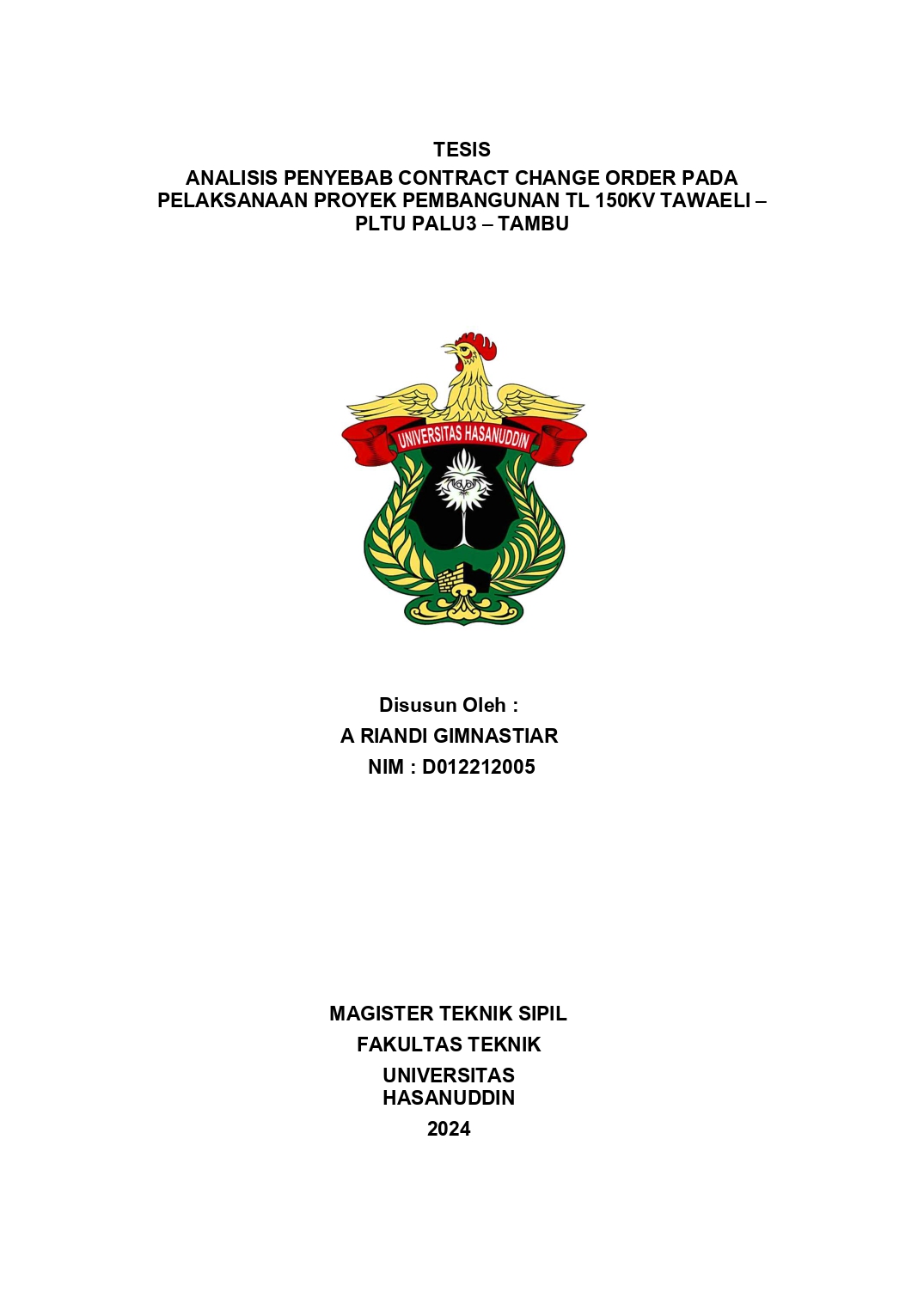 GIMNASTIAR, A. RIANDI (2025) ANALISIS PENYEBAB CONTRACT CHANGE ORDER PADA PELAKSANAAN PROYEK PEMBANGUNAN TL 150KV TAWAELI – PLTU PALU3 – TAMBU = Analysis of the Contract Change Order in the Implementation of the TL 150KV Tawaeli – PLTU Palu3 – Tambu Construction Project. Thesis thesis, Universitas Hasanuddin.
