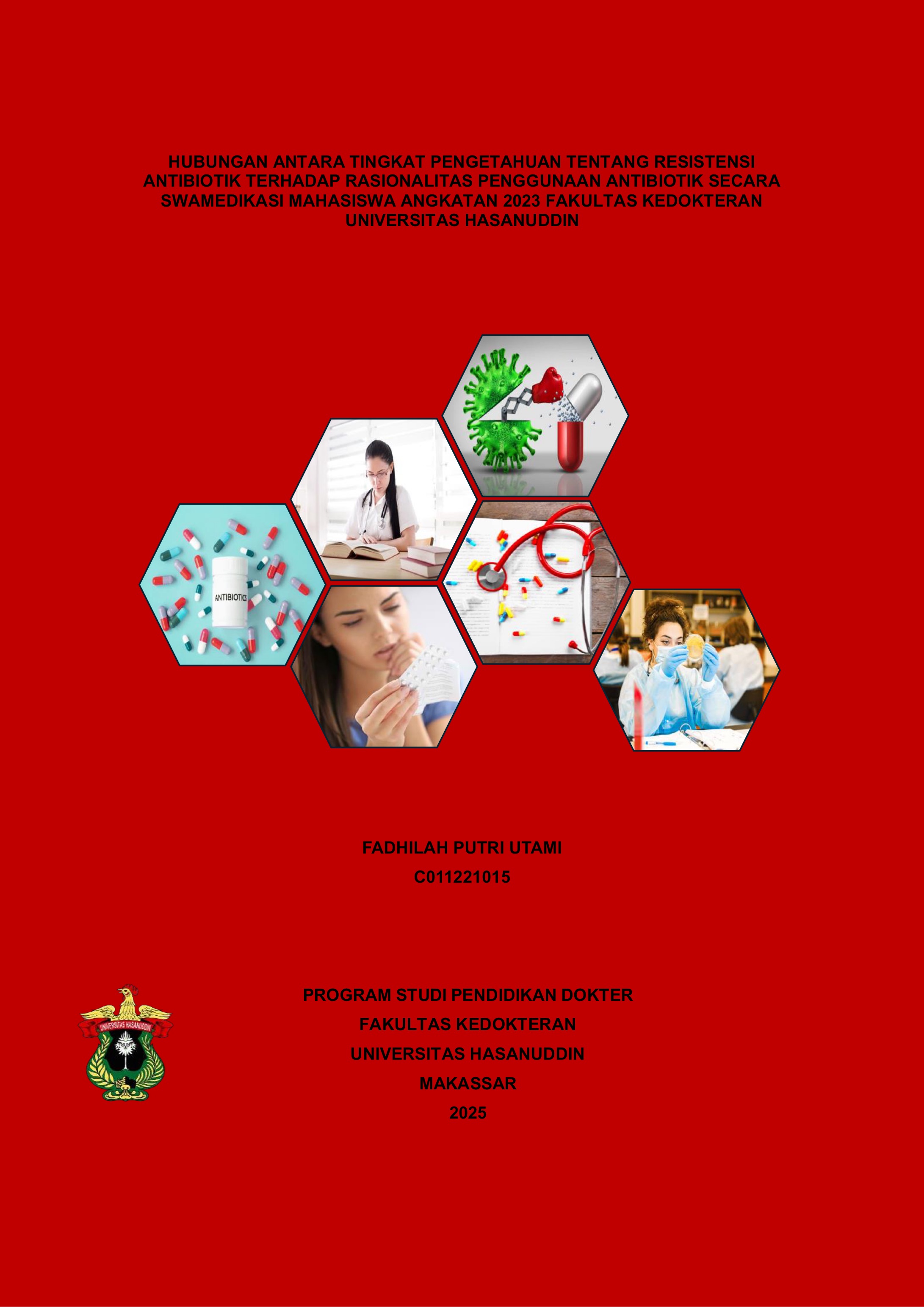 FADHILAH PUTRI UTAMI. Hubungan Antara Tingkat Pengetahuan tentang Resistensi Antibiotik terhadap Rasionalitas Penggunaan Antibiotik secara Swamedikasi Mahasiswa Angkatan 2023 Fakultas Kedokteran Universitas Hasanuddin (dibimbing oleh Prof. dr. Firdaus Hamid, Ph.D., Sp.MK(K)). Latar Belakang: Resistensi antibiotik merupakan masalah kesehatan global yang semakin meningkat akibat penggunaan antibiotik yang tidak rasional, termasuk melalui swamedikasi. Praktik ini dapat memperburuk resistensi dan menurunkan efektivitas terapi. Mahasiswa kedokteran sebagai calon tenaga medis diharapkan memiliki pengetahuan yang baik agar mampu menggunakan antibiotik secara bijak dan rasional. Tujuan: Mengetahui hubungan antara tingkat pengetahuan tentang resistensi antibiotik dengan rasionalitas penggunaan antibiotik secara swamedikasi pada mahasiswa angkatan 2023 Fakultas Kedokteran Universitas Hasanuddin. Metode Penelitian: Penelitian analitik dengan pendekatan potong lintang (cross-sectional) pada 211 mahasiswa yang dipilih secara volunteer sampling. Data dikumpulkan melalui kuesioner dan dianalisis menggunakan uji chi-square. Hasil: Mayoritas responden perempuan (53,08%). Sebanyak 72,04% pernah melakukan swamedikasi antibiotik. Tingkat pengetahuan sebagian besar kurang (41,71%), dan penggunaan antibiotik secara swamedikasi tergolong tidak rasional pada 84,87% responden. Uji chi-square menunjukkan p = 0,000, menandakan hubungan signifikan antara pengetahuan dan rasionalitas penggunaan antibiotik.