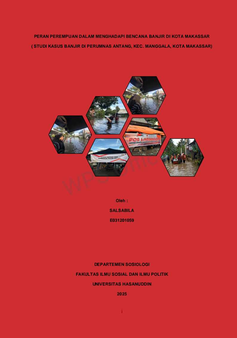 SALSABILA, SALSABILA (2025) Peran Wanita dalam Menghadapi Bencana Banjir di Kota Makassar (Studi Kasus Bencana Banjir di Perumnas Antang, Kecamatan Manggala, Kota Makassar) = The Role of Women in Facing Flood Disasters in Makassar City (Case Study of Flood Disasters in Perumnas Antang, Manggala District, Makassar City). Skripsi thesis, UNIVERSITAS HASANUDDIN.