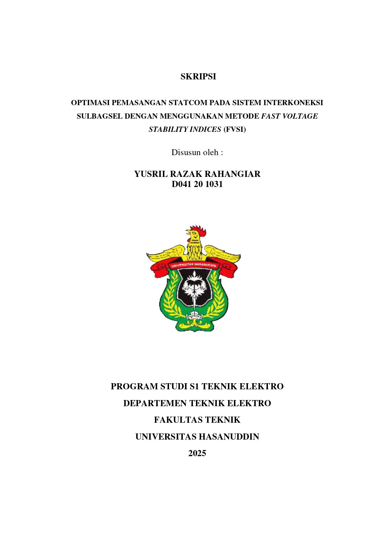 RAHANGIAR, YUSRIL RAZAK (2027) Optimasi Pemasangan STATCOM pada Sistem Interkoneksi SULBAGSEL dengan Metode Fast Voltage Stability Indices (FVSI) = Optimization of STATCOM Placement on the SULBAGSEL Interconnection System Using the Voltage Stability Indices (FVSI). Skripsi thesis, Universitas Hasanuddin.