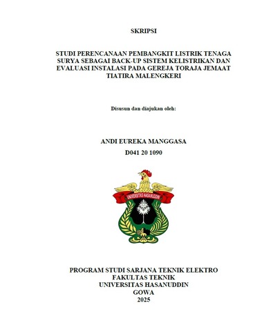 MANGGASA, ANDI EUREKA (2025) Studi Perencanaan Pembangkit Listrik Tenaga Surya Sebagai Back-Up Sistem Kelistrikan Dan Evaluasi Instalasi Pada Gereja Toraja Jemaat Tiatira Malengkeri = Solar Power Plant Planning Study as a Back-up of the Electrical System and Installation Evaluation at the Toraja Church of the Tiatira Malengkeri Congregation. Skripsi thesis, Universitas Hasanuddin.