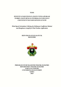 KATUUK, HEIN FRANS JULES (2025) PENENTUAN KECEPATAN ANGIN UNTUK APLIKASI TURBIN ANGIN DENGAN PENDEKATAN HELLMAN COEFFICIENT DAN ROUGHNESS LENGTH = Wind Speed Calculation Utilizing the Hellmann Coefficient Method and Roughness Length for Wind Turbine Application. Thesis thesis, Universitas Hasanuddin.