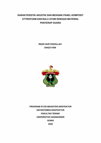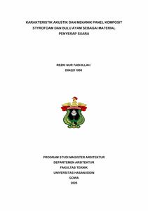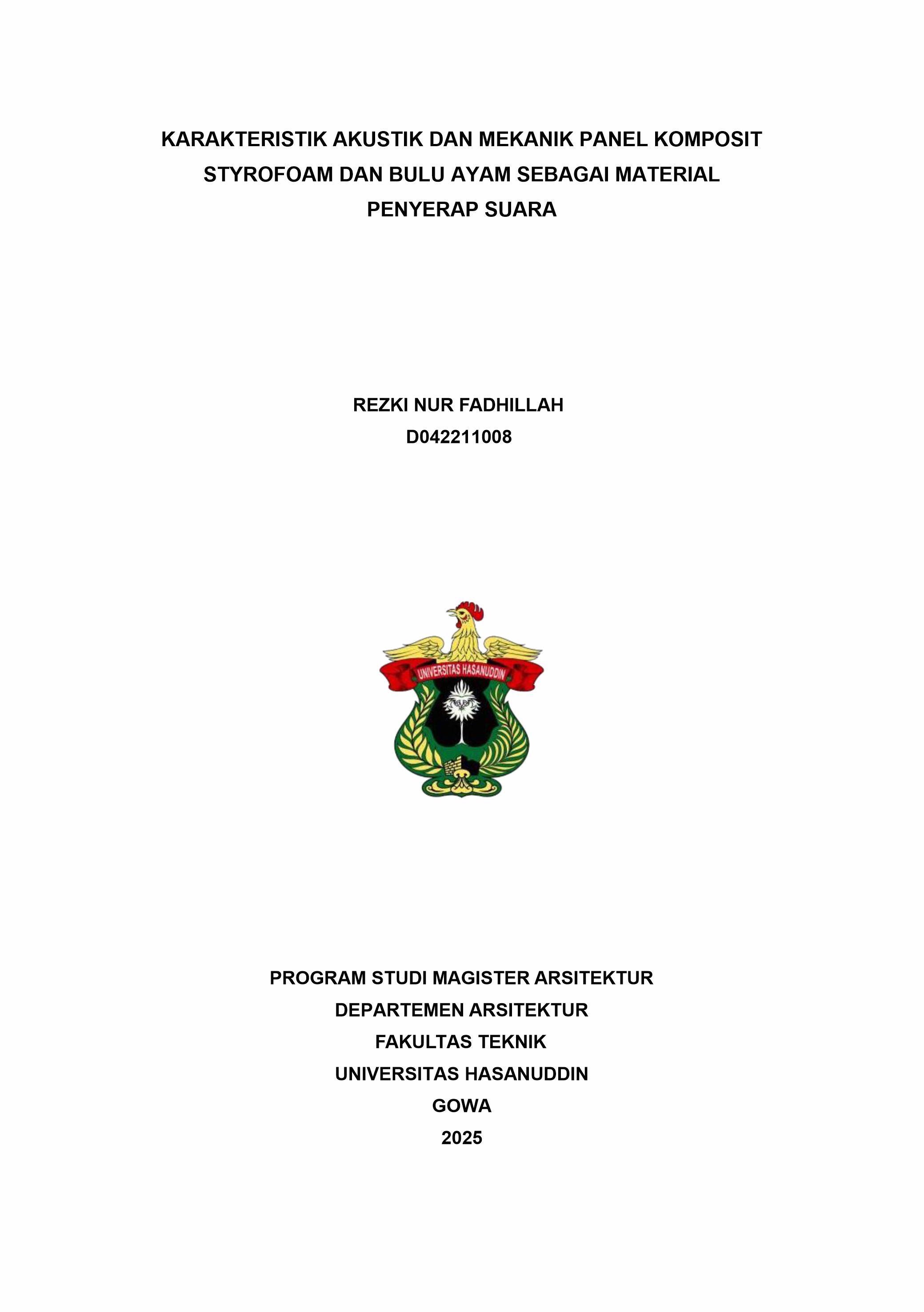 FADHILLAH, REZKI NUR (2025) Karakteritik Akustik dan Mekanik Panel Komposit Styrofoam dan Bulu Ayam sebagai Material Penyerap Suara = Acoustic and Mechanical Characteristics of Styrofoam and Chicken Feathers Composite Panel As Sound Absorption Material. Thesis thesis, Universitas Hasanuddin.