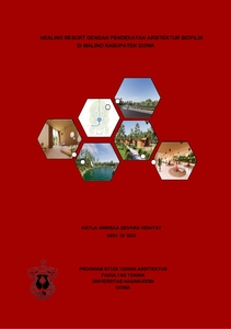 Tingginya tingkat stres masyarakat perkotaan di Indonesia mendorong perlunya fasilitas yang mendukung relaksasi dan penyembuhan, terutama melalui pendekatan yang menghubungkan manusia dengan alam. Skripsi ini membahas perancangan Healing Resort dengan Pendekatan Arsitektur Biofilik di Malino, Kabupaten Gowa, Sulawesi Selatan. Pendekatan arsitektur biofilik diterapkan untuk menciptakan lingkungan binaan yang mendukung kesehatan mental dan fisik melalui elemen-elemen alami seperti pencahayaan alami, ventilasi, lanskap, dan material berbasis alam. Kawasan wisata Hutan Pinus Malino memiliki potensi besar sebagai lokasi resort berbasis penyembuhan, mengingat kondisi lingkungannya yang sejuk, pemandangan alam yang indah, dan aksesibilitas yang baik. Analisis perancangan meliputi aspek tapak seperti kontur tanah, orientasi matahari, arah angin, dan tingkat kebisingan. Prinsip arsitektur biofilik diaplikasikan melalui integrasi elemen alam dalam ruang-ruang resort, baik secara langsung seperti taman outdoor dan kolam renang, maupun tidak langsung seperti pencahayaan alami dan penggunaan material organik. Hasil perancangan meliputi rancangan ruang yang terdiri dari fasilitas penginapan, area spa, yoga, meditasi, restoran, dan fasilitas rekreasi outdoor. Konsep zonasi dirancang untuk menciptakan harmoni antara bangunan dan alam, dengan mempertahankan kontur alami tapak serta meminimalkan dampak lingkungan. Resort ini tidak hanya dirancang sebagai tempat relaksasi tetapi juga sebagai model penerapan konsep keberlanjutan dalam arsitektur. Penerapan arsitektur biofilik diharapkan memberikan pengalaman holistik bagi pengunjung serta meningkatkan kesadaran akan pentingnya hubungan manusia dengan alam.