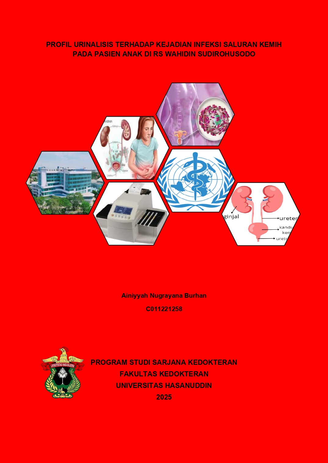 AINIYYAH NUGRAYANA BURHAN. Profil Urinalisis Terhadap Kejadian Infeksi Saluran Kemih pada Pasien Anak di RS Wahidin Sudirohusodo (dibimbing oleh Sulmiati) Latar Belakang: Infeksi saluran kemih (ISK) didefinisikan sebagai kolonisasi dari suatu patogen yang dapat timbul dimana saja pada sepanjang traktus urinarius, seperti ginjal, ureter, vesika urinaria, dan uretra. Penegakan diagnosis ISK dapat dilakukan melalui urinalisis yang merupakan pemeriksaan sederhana, cepat, dan tersedia secara luas dengan melihat adanya leukosit, nitrit, atau bakteri dalam urin, yang masing-masing memiliki nilai prediktif tinggi dalam mendeteksi ISK. Tujuan: Penelitian ini bertujuan untuk mengetahui profil urinalisis terhadap kejadian Infeksi Saluran Kemih pada pasien anak di RS Wahidin Sudirohusodo. Metode: Penelitian ini menggunakan desain penelitian observasional analitik dengan pendekatan retrospektif dan sampel yang diteliti sebanyak 294 pasien dengan data yang diteliti merupakan rekam medis pasien ISK anak di RS Wahidin Sudirohusodo periode Januari 2019 hingga Desember 2024 dengan data yang diambil berupa jenis kelamin, usia, serta kadar nitrit dan leukosit dari hasil urinalisis. Hasil: Temuan penelitian ini menemukan bahwa pasien ISK anak yang diperoleh sebanyak 254 pasien sebagian besar dialami oleh anak usia sekolah (52.4%) dengan didominasi pasien perempuan (62.2%) dan sebagian besar pasien memiliki kadar nitrit negatif (83.9%) dan kadar leukosit positif (68.1%).
