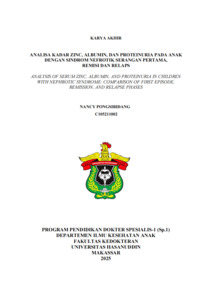 PONGSIBIDANG, NANCY (2025) ANALISA KADAR ZINC, ALBUMIN, DAN PROTEINURIA PADA ANAK DENGAN SINDROM NEFROTIK SERANGAN PERTAMA, REMISI DAN RELAPS = ANALYSIS OF SERUM ZINC, ALBUMIN, AND PROTEINURIA IN CHILDREN WITH NEPHROTIC SYNDROME: COMPARISON OF FIRST EPISODE, REMISSION, AND RELAPSE PHASES. Thesis thesis, Universitas Hasanuddin.