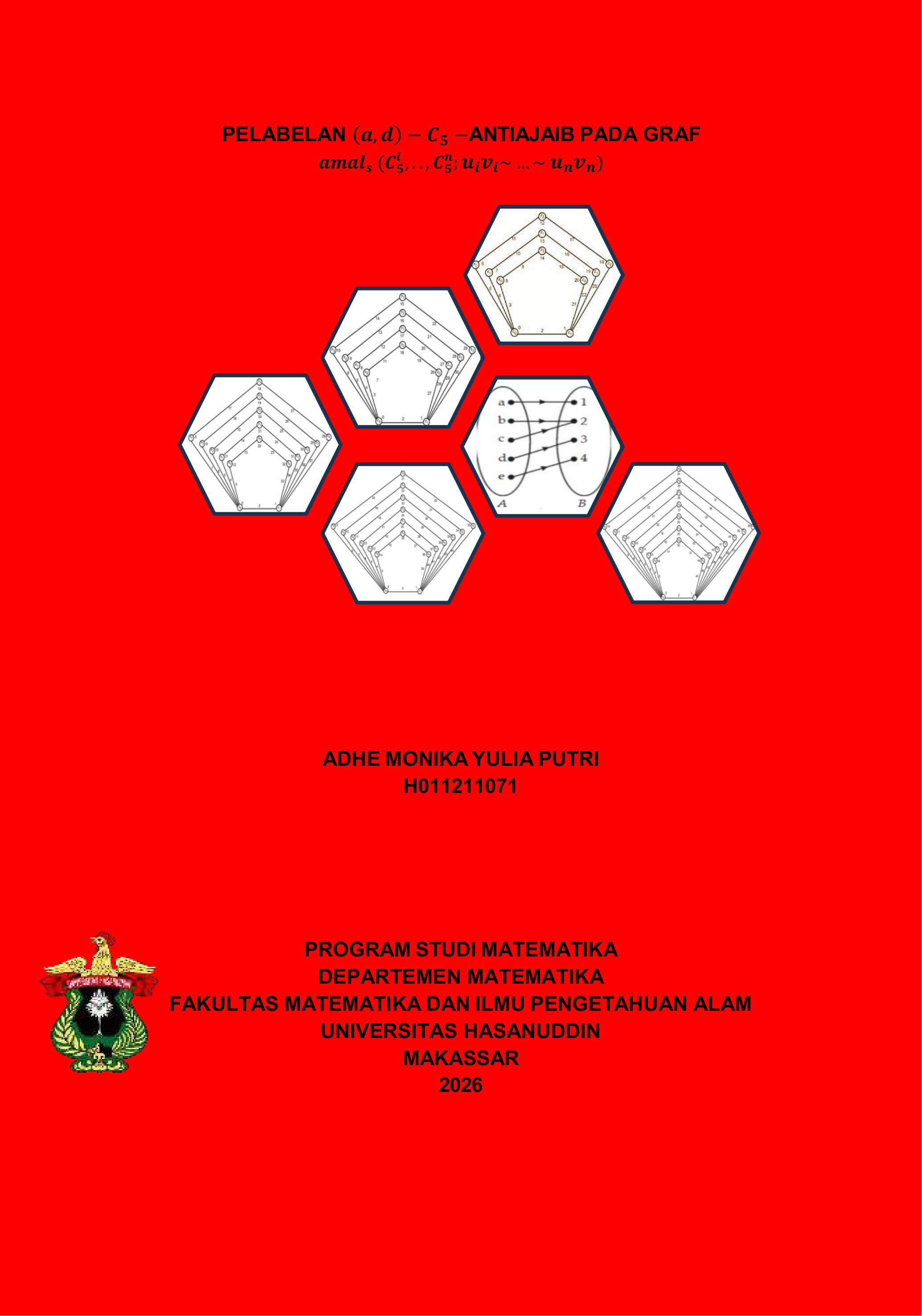 PUTRI, ADHE MONIKA YULIA (2026) PELABELAN (a, d) - C5 - ANTIAJAIB PADA GRAF amal S (C5, ..., Cn; uivi`... `unvn) = LABELING (a,d)-C_5-ANTIMAGIC ON GRAPH 〖amal〗_s (C_5^i,..,C_5^n;u_i v_i~…~ u_n v_n). Skripsi thesis, Universitas Hasanuddin.