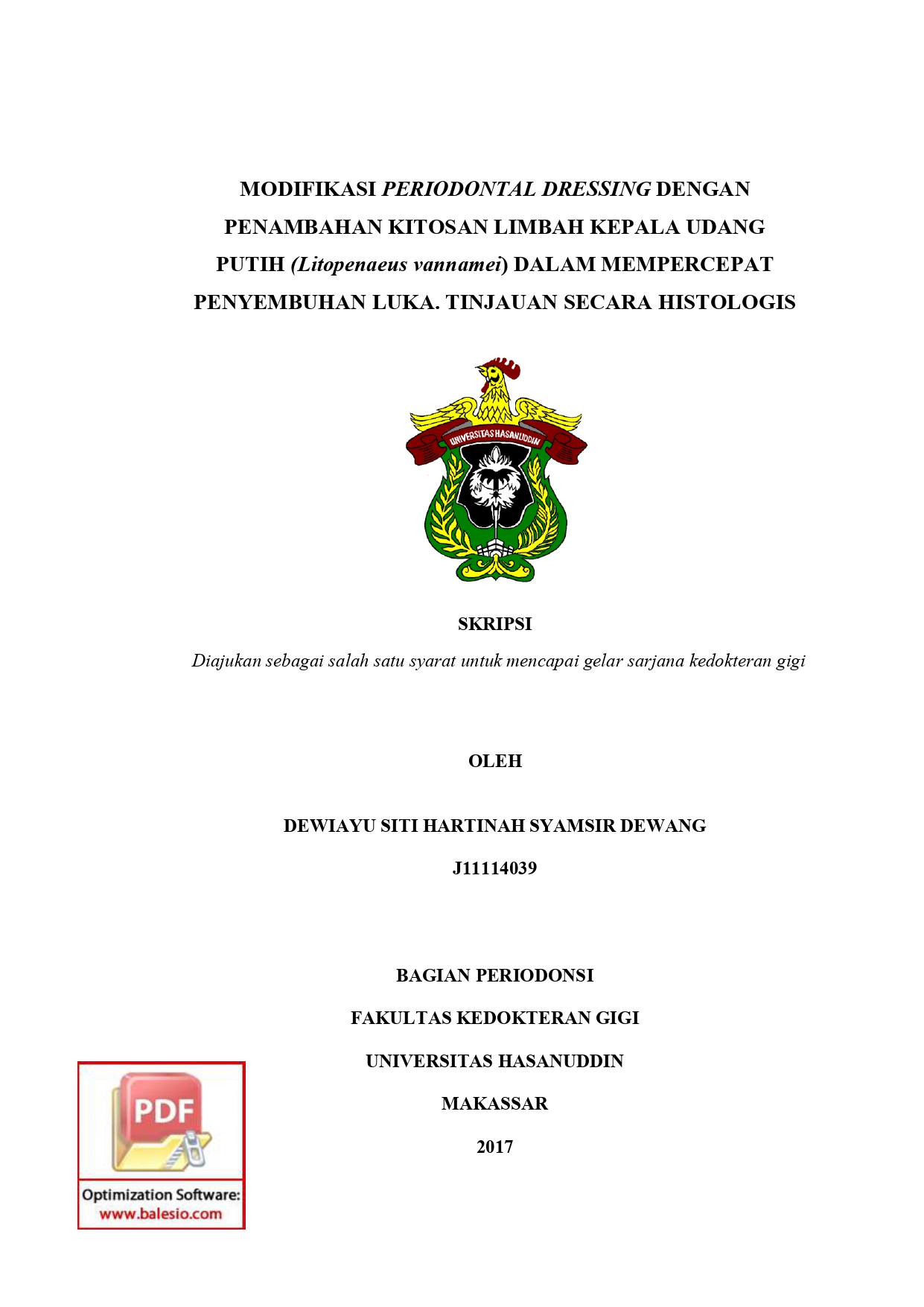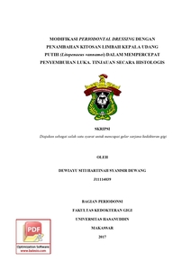 SYAMSIR DEWANG, DEWIAYU SITI HARTINAH (2017) MODIFIKASI PERIODONTAL DRESSING DENGAN PENAMBAHAN KITOSAN LIMBAH KEPALA UDANG PUTIH (Litopenaeus vannamei) DALAM MEMPERCEPAT PENYEMBUHAN LUKA. TINJAUAN SECARA HISTOLOGIS = Modification of Periodontal Dressing with the Addition of Chitosan from White Shrimp Exoskeleton Waste (Litopenaus Vannamei) in Accelerating Wound Healing. Histological review. Skripsi thesis, UNIVERSITAS HASANUDDIN.