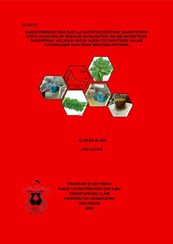 JEN, AL FIKAR M. (2026) KARAKTERISASI FISIS DAN UJI AKTIVITAS EKSTRAK DAUN PEPAYA SERTA DAUN KELOR SEBAGAI KATALISATOR DALAM BIOSINTESIS NANOPERAK: APLIKASI UNTUK AGEN FOTOSENTIZER DALAM FOTODINAMIK INAKTIVASI MIKROBA PATOGEN = PHYSICAL CHARACTERIZATION AND ACTIVITY TEST OF PAPAYA LEAF EXTRACT AND MORINGA LEAF AS CATALYZERS IN NANOSILVER BIOSYNTHESIS: APPLICATION FOR PHOTOSENTIZER AGENTS IN PHOTODYNAMIC INACTIVATION OF PATHOGENIC MICROBES. Skripsi thesis, Universitas Hasanuddin.